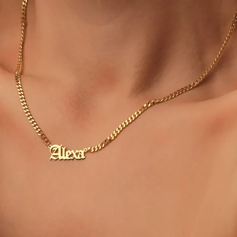Personalized Old English Stainless Steel Necklace For Women Custom Name Letter Pendant Cuba Chain Men Collar Vintage Jewelry