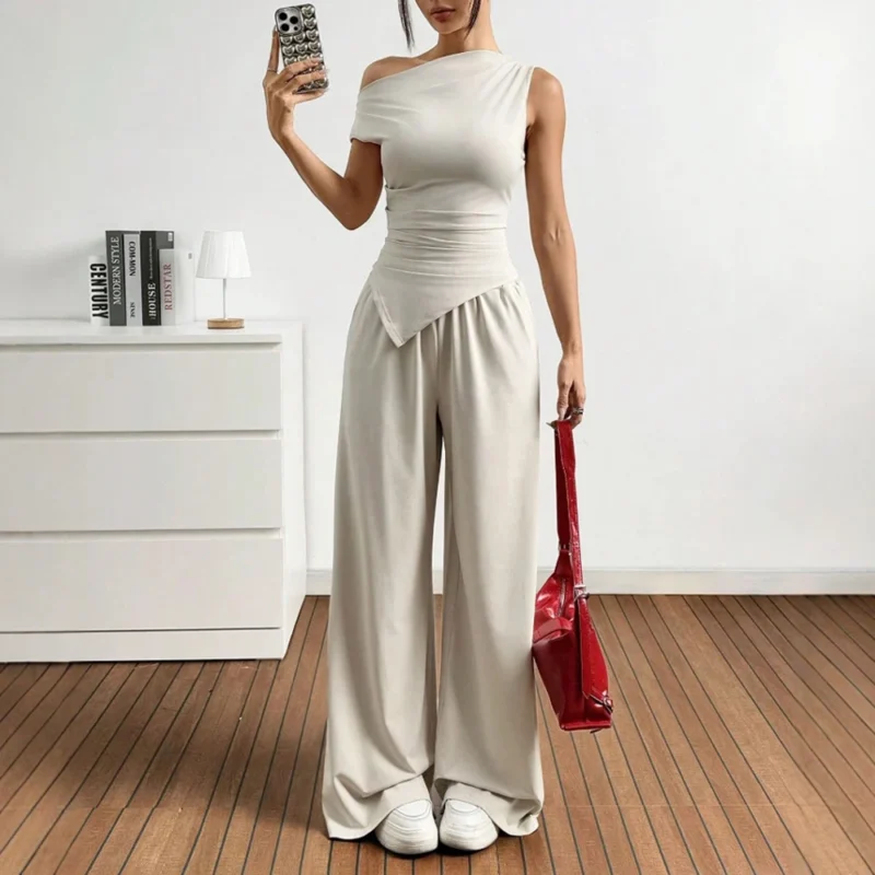 Women’s Sets Plain Short Sleeve One-Shoulder Blouses Full Length Wide Leg Pants Summer Asymmetrical Sets For Women