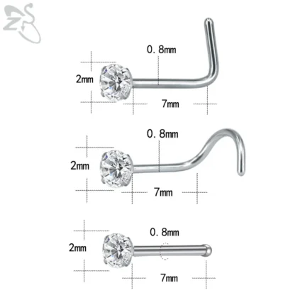 ZS 8-14pcs/lot Stainless Steel Nose Stud Set 2MM Colorful CZ Crystal Nose Piercings Screw L Shape Nostril Piercings Jewelry 20g