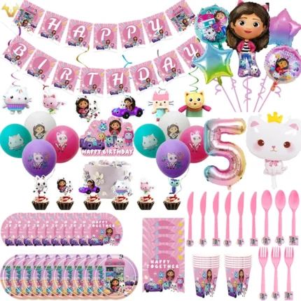 Gabby Dollhouse Birthday Decoration Disposable Tableware Napkins Cups Tablecloth Plates Gabby Cat Balloon Supplies Party Favor