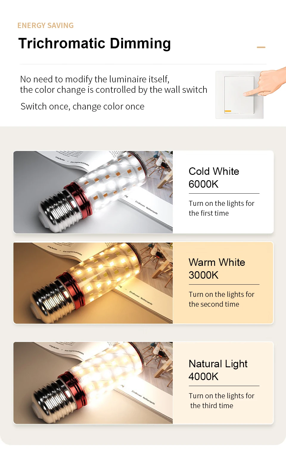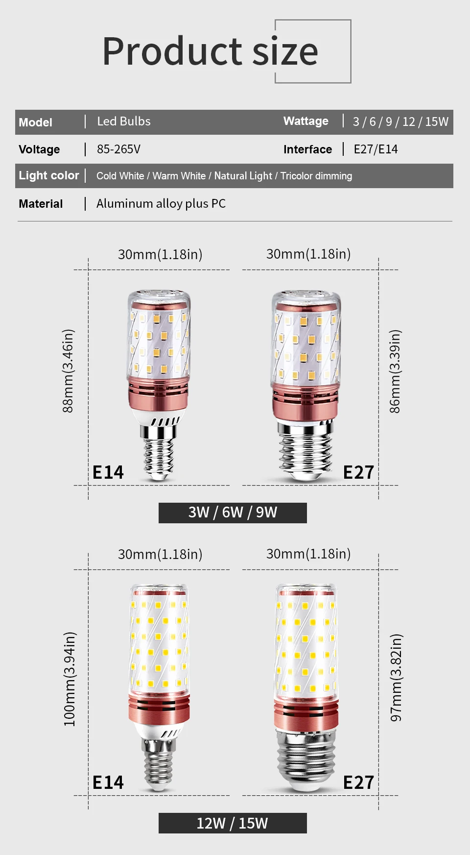 * Light color: warm white (3000K)/cold white (6000K)/Natural Light(4000K)/Tricolor dimming