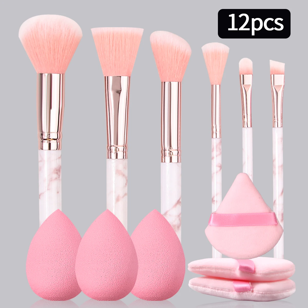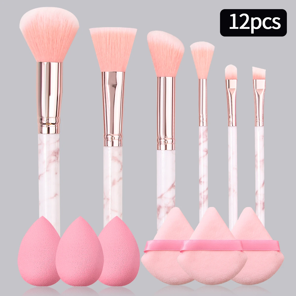 12PCS pink set 6pcs marble brush set +3pcs super soft and delicate powder free makeup egg +3pcs soft setting triangle Puff
