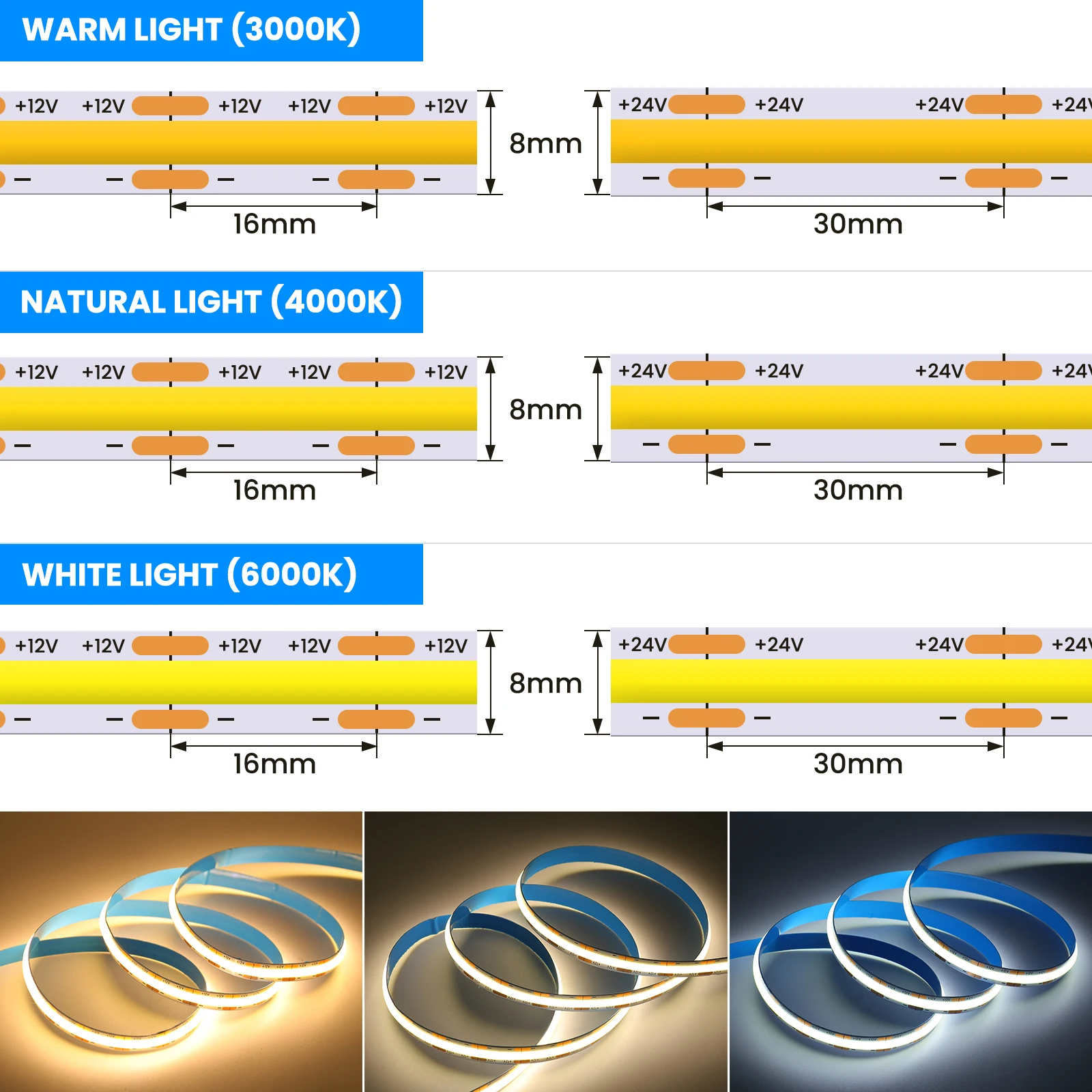 PCB board width: 5mm(320LEDs/m),8mm(384/480/528LEDs/m),12mm(600LEDs/m),30mm(1600LEDs/m)