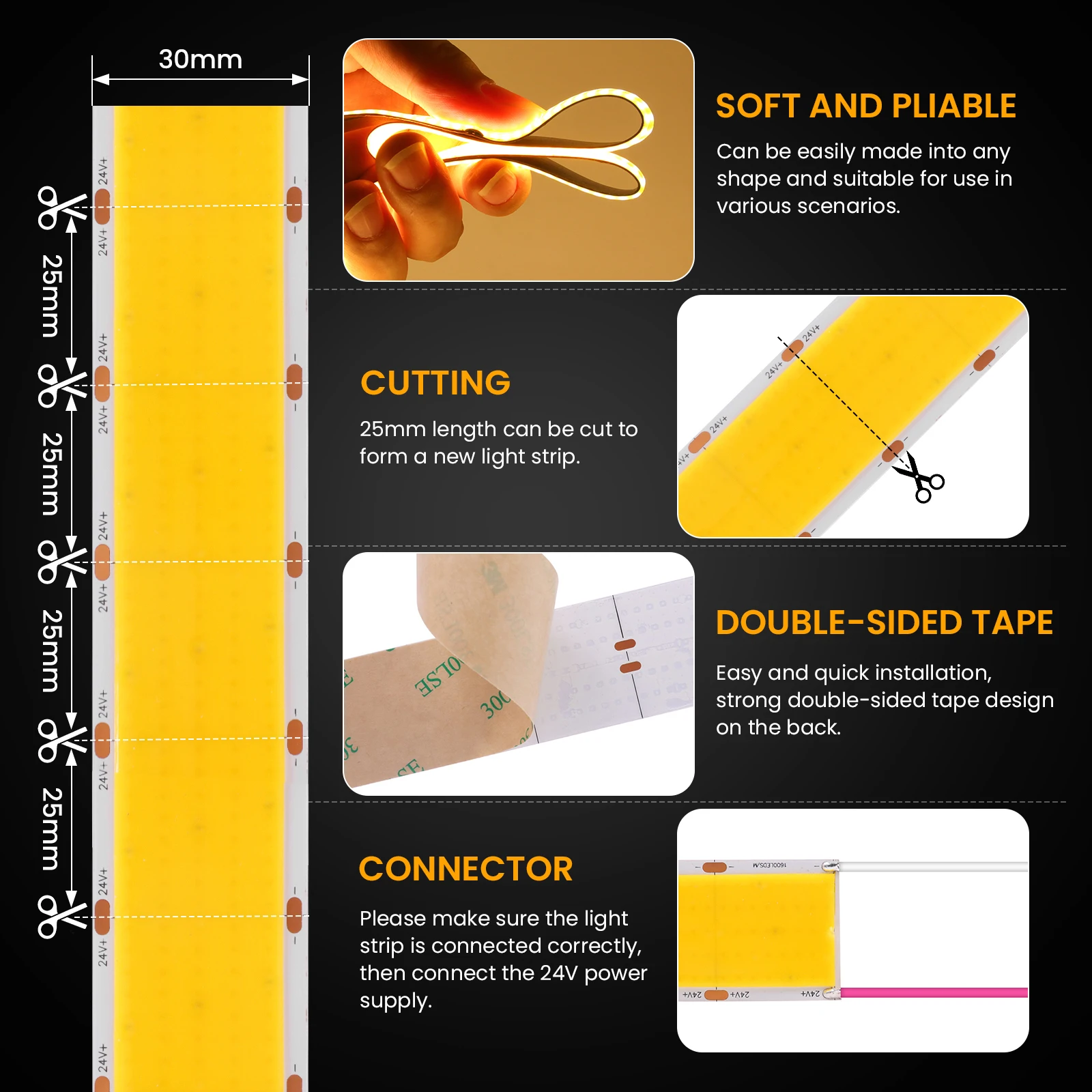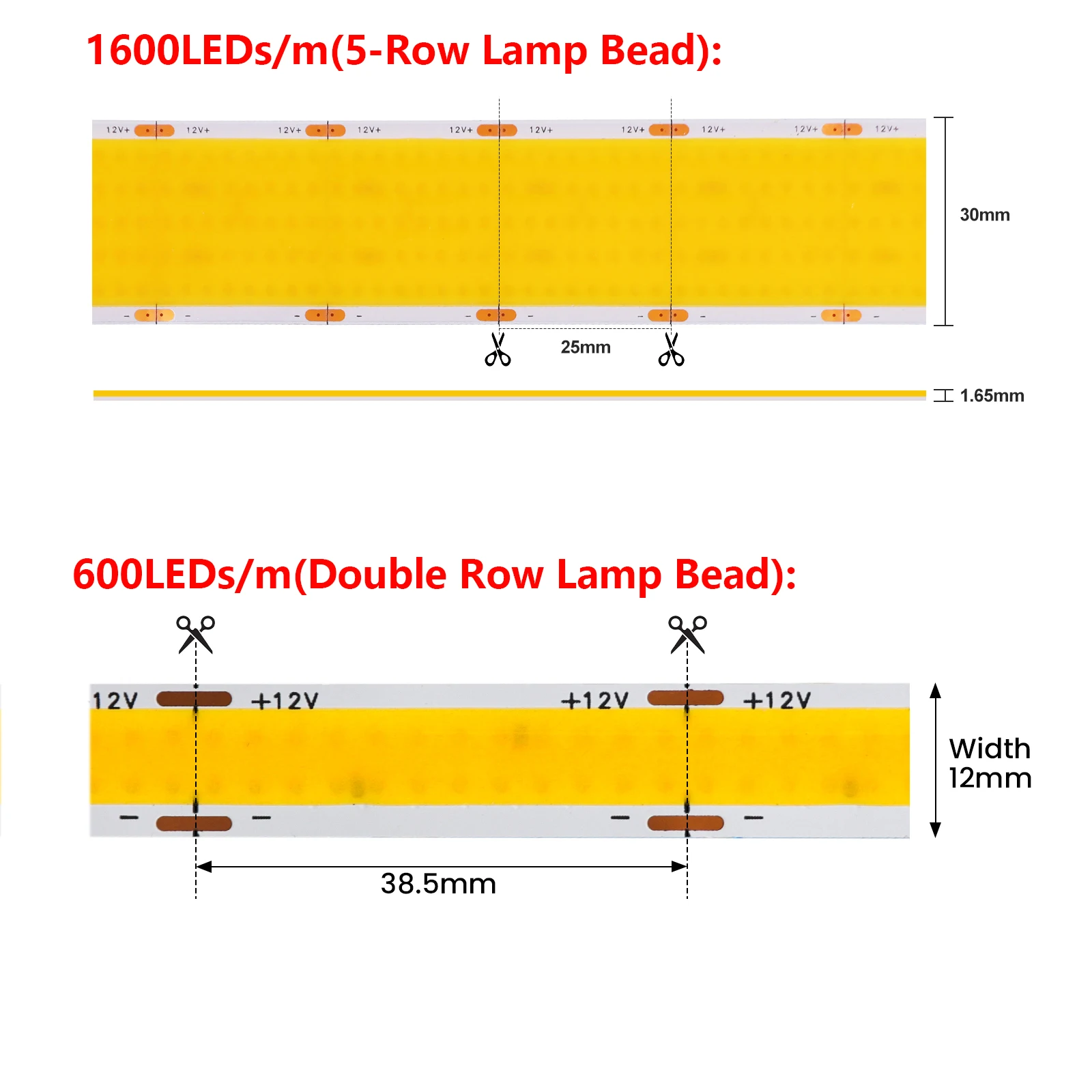 PCB board width: 5mm(320LEDs/m),8mm(384/480/528LEDs/m),12mm(600LEDs/m),30mm(1600LEDs/m)