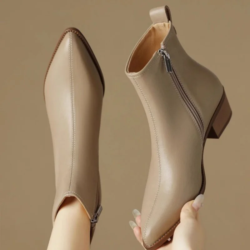 2025 New Women’s Ankle Boots – Minimalist Pointed Toe Mid Heel Booties with Soft Leather & Side Zipper, Slimming Fashion Boots