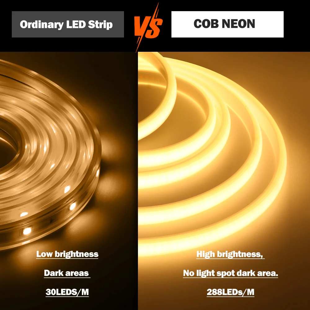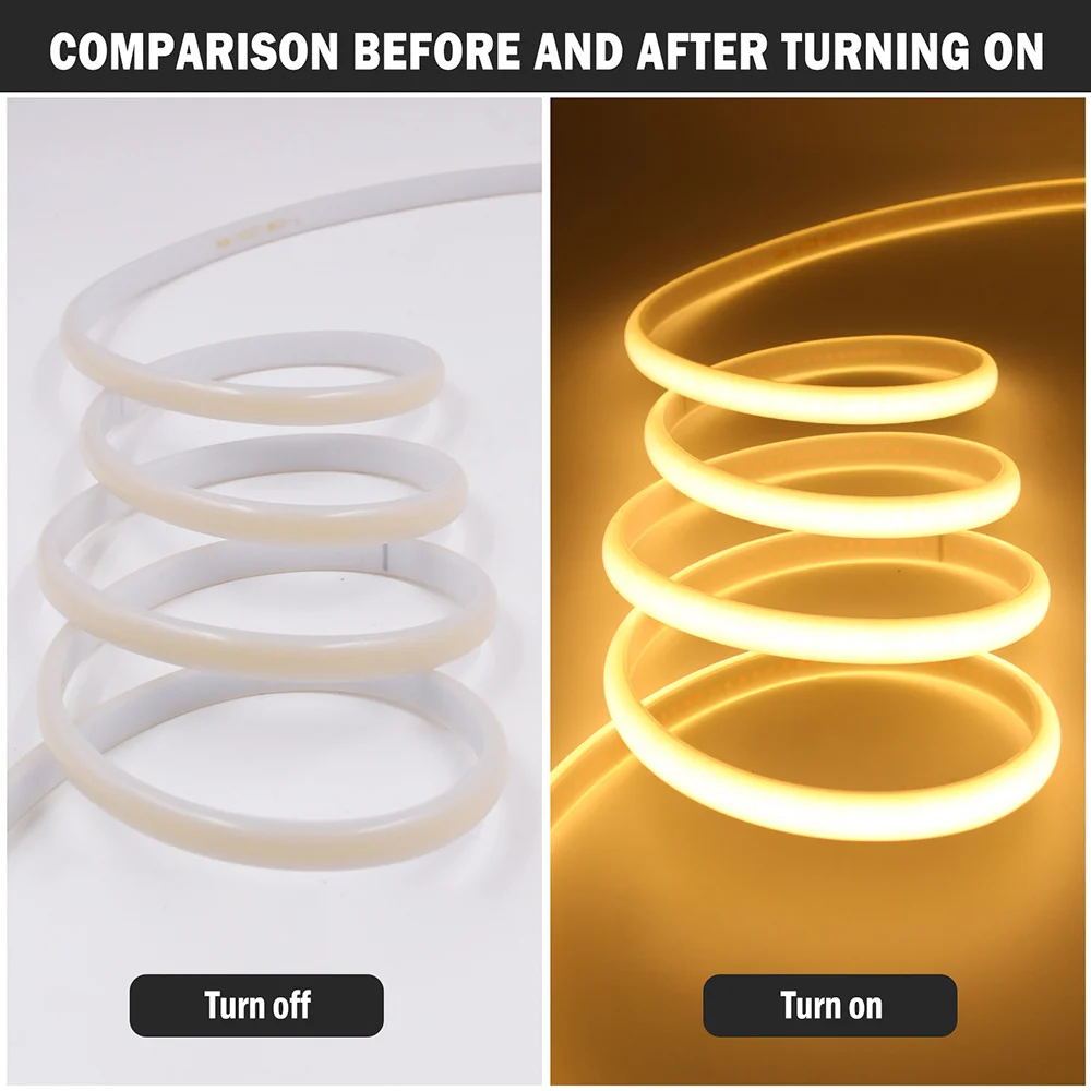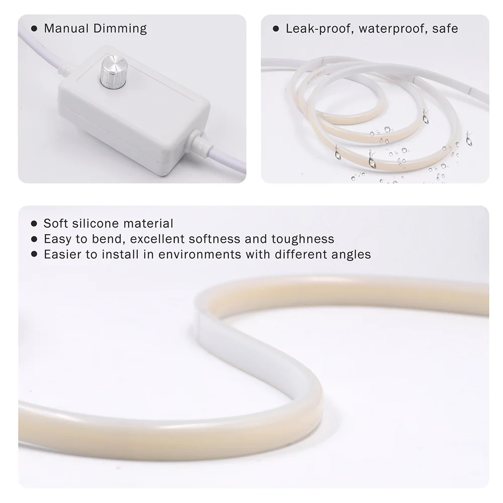 Upgraded COB Neon LED Strip: Encapsulated in flexible transparent silicone tubing, providing consistent and even lighting. Supports dimming control for energy-saving and convenience.