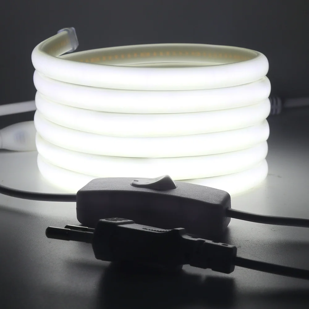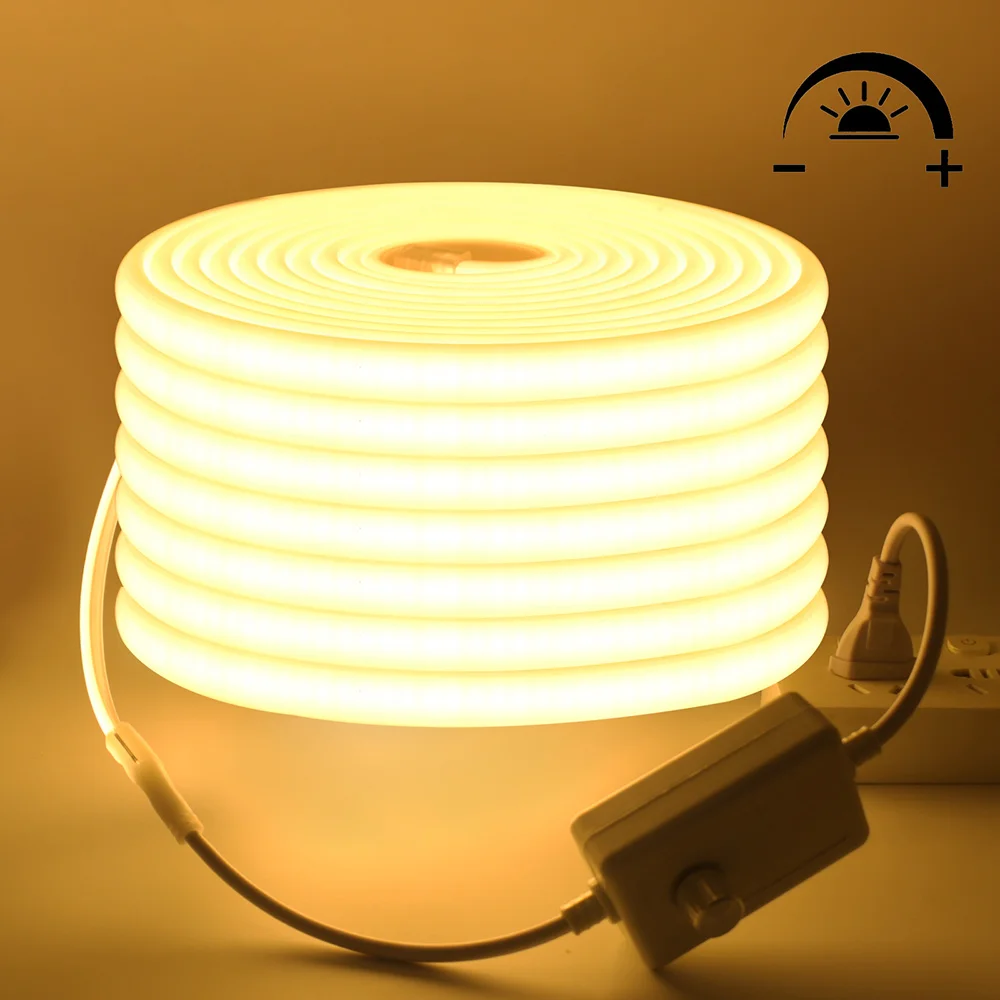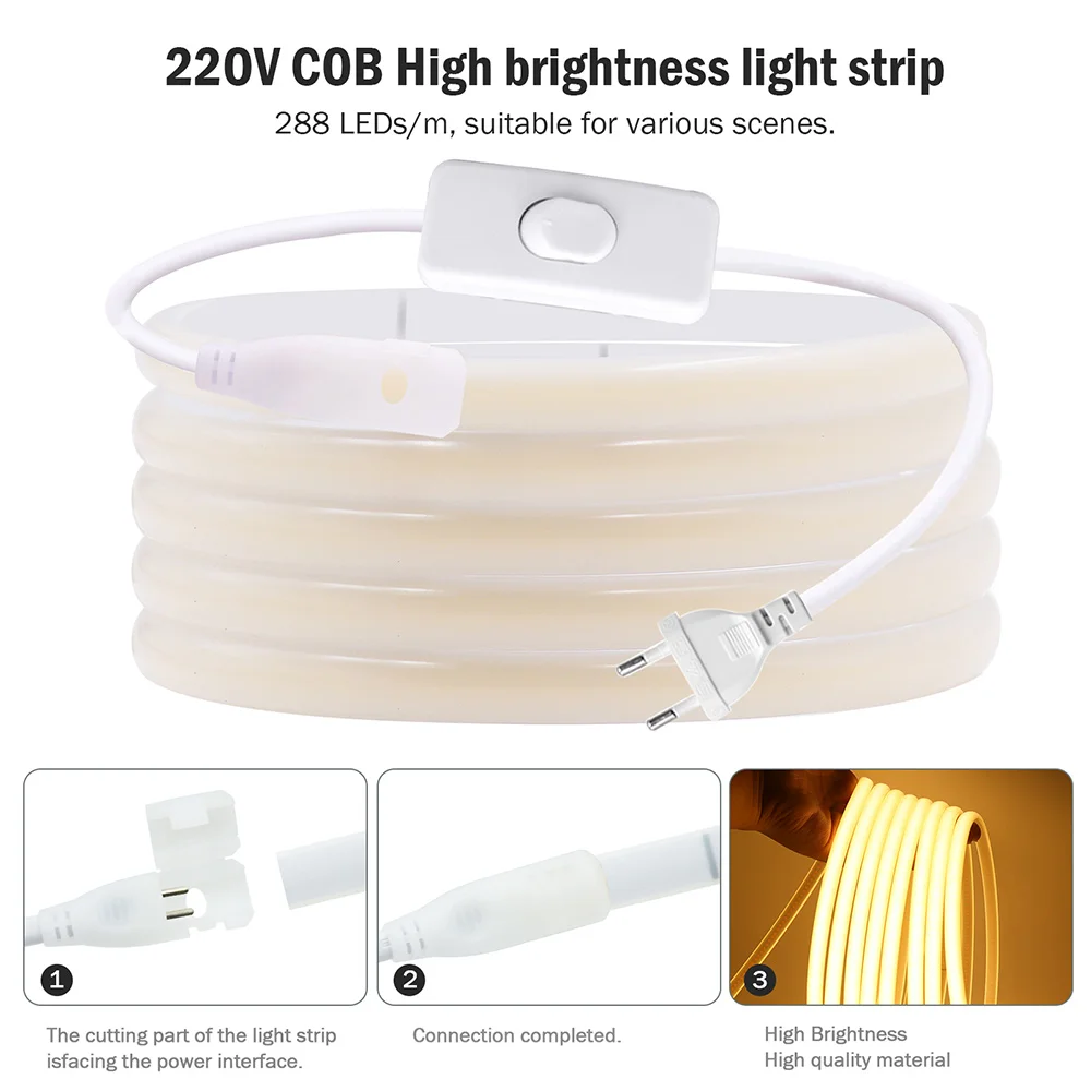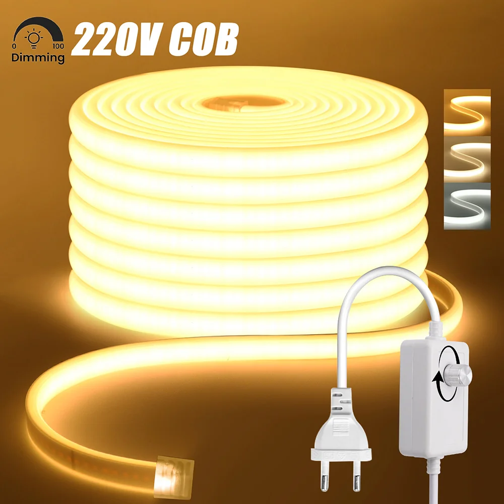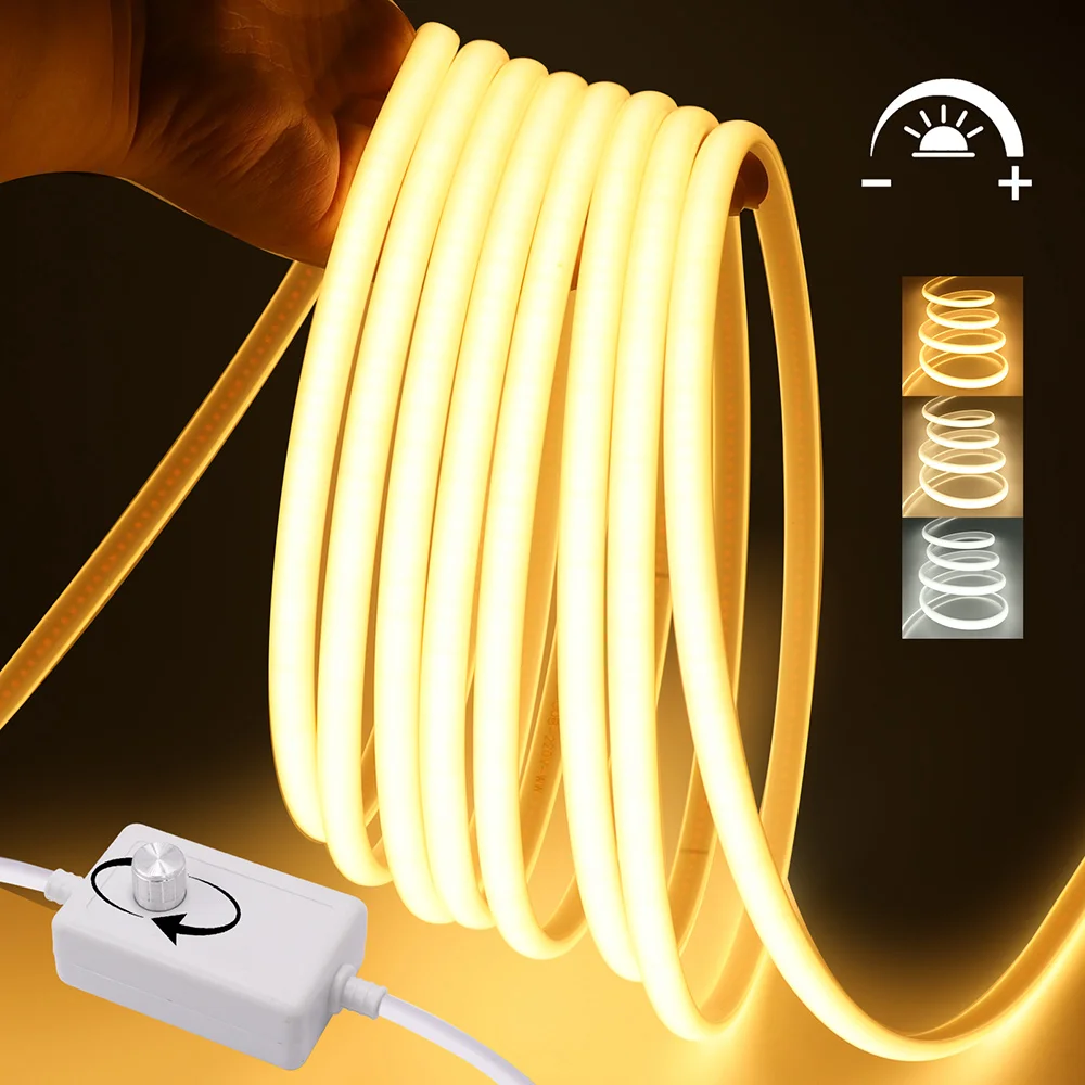 220V Dimmer Switch COB LED Strip Light Power Plug Kit Dimmable 288LED/M 3000K 4000K 6000K RA90 Flex Waterproof Linear Lighting