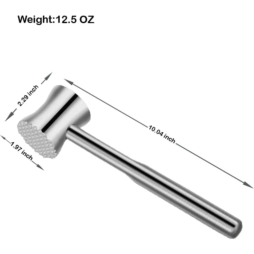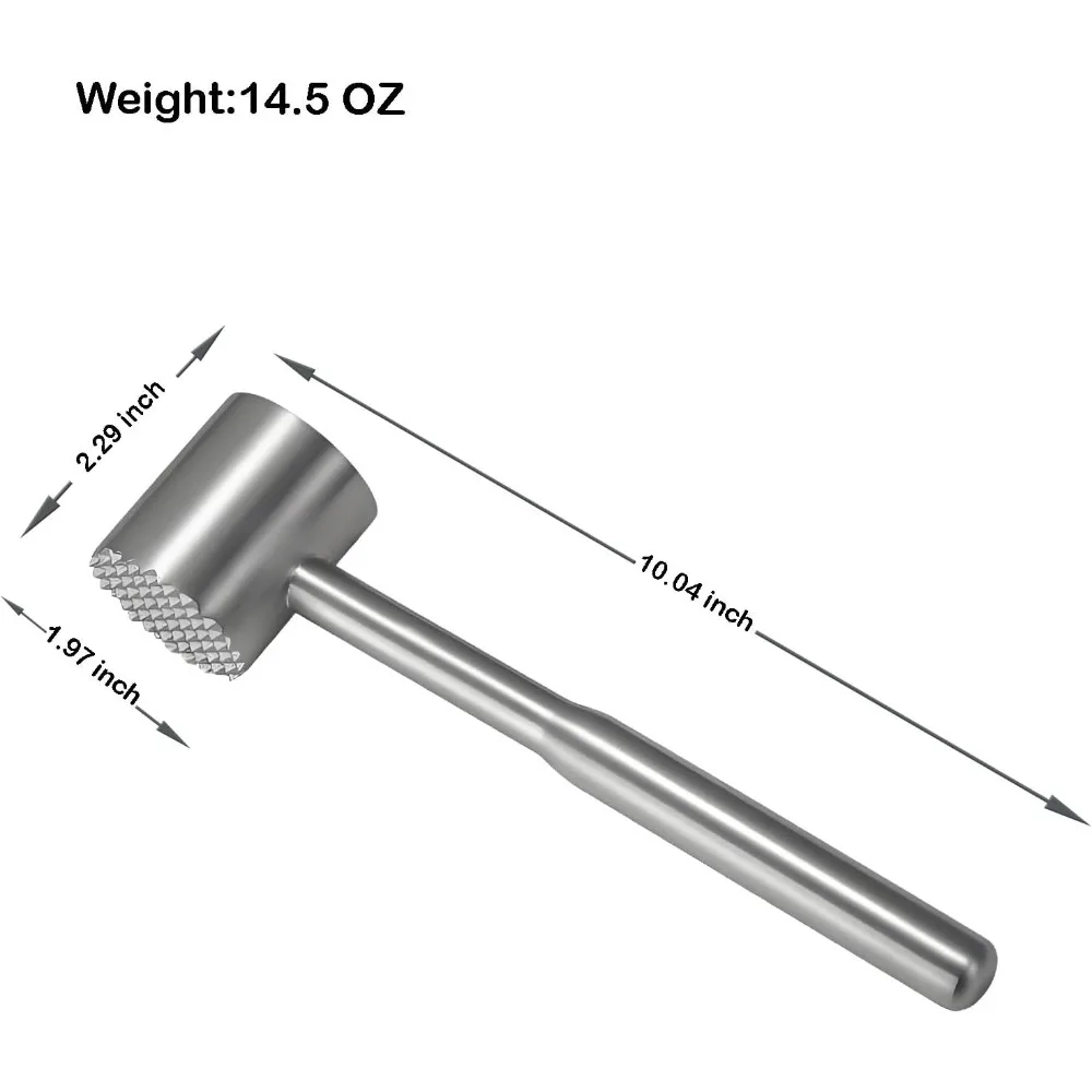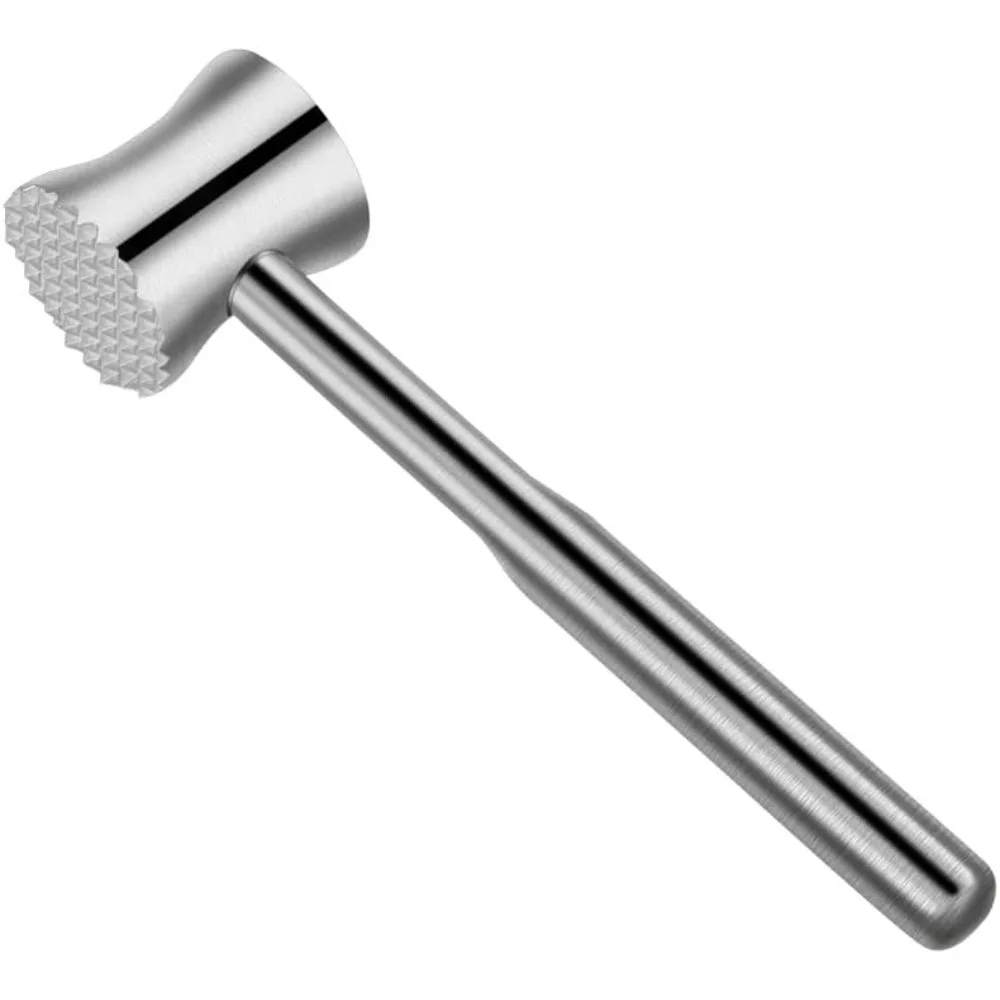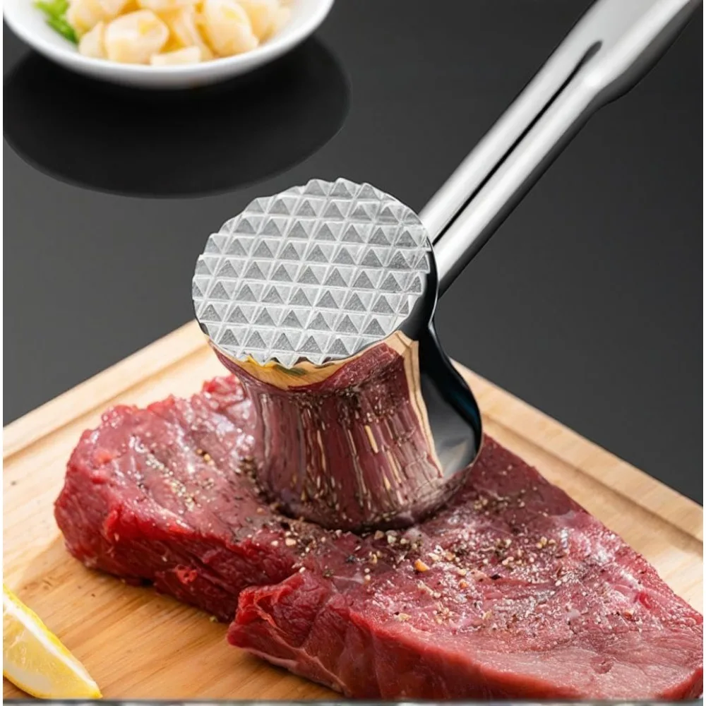 4. Versatile Kitchen Tool: This meat tenderizer is not only suitable for tenderizing steaks and pork chops, but can also be used to crush ice, pound garlic, pound cucumbers, and crack nuts. Its sleek stainless steel design is easy to clean and dishwasher-safe, making it a practical addition to any kitchen.