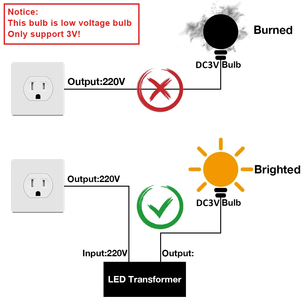 Notice:These bulb is DC 3V bulbs,please don’t install with AC110V and 220V .