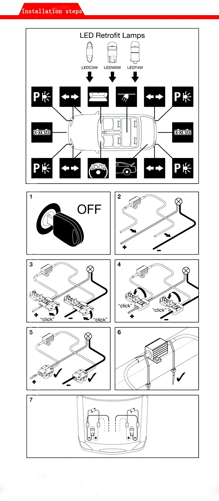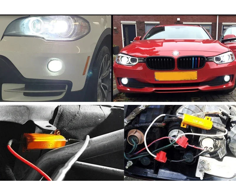 5.It is recommended to use 50W for brake lights, front fog lights (change to surround), and other light bulbs with large current requirementsInstallation is easy! Put the wire into the button hole of the wire clip, press the button, and then fix the resistor body and it’s OK. It’s that simple! Can solve the problem of false alarms, false alarms, and stroboscopic (connect resistors in parallel to the positive and negative poles of the alarm stroboscopic bulb)