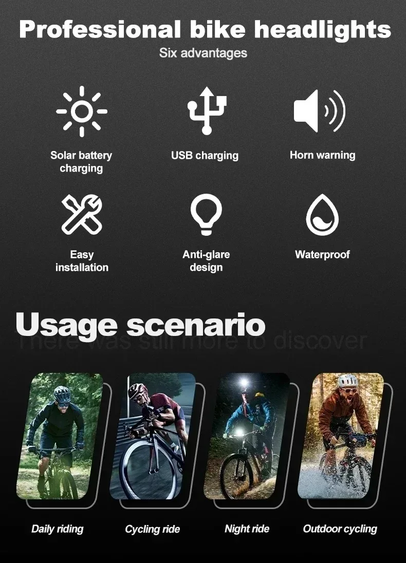 1.Dual-Beam Illumination: Equipped with both high-beam and wide-angle lights, this bike headlight ensures long-distance visibility and a broad field of illumination for safer riding in all conditions.