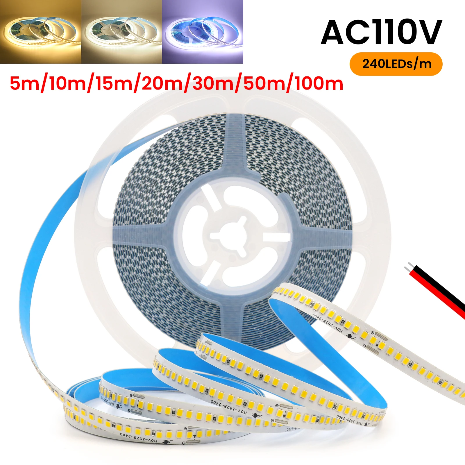 AC 110V 220V LED Strip With 2PIN Cable 240Leds/M IP44 3000K 4000K 7000K Self Adhesive Flexible Ribbon Stripe Home Decor Light