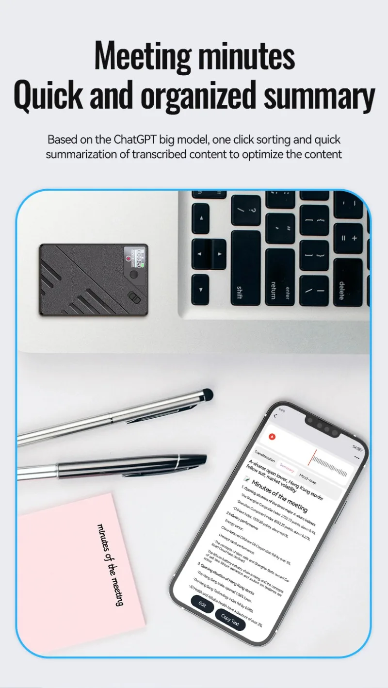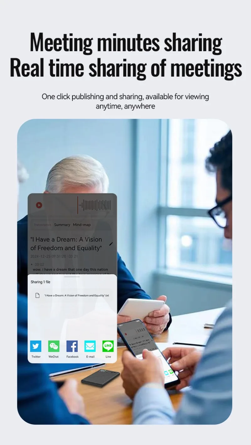 **Efficient Meeting Recording: Based on ChatGPT’s large model, it provides one-click sorting and quick summarization functions to help you optimize meeting records and save valuable time.** Furthermore, meeting minutes can be published and shared with a single click, making sharing easy anytime, anywhere.