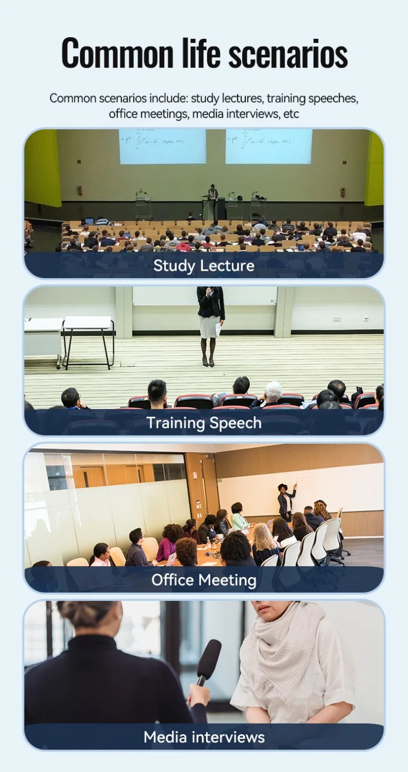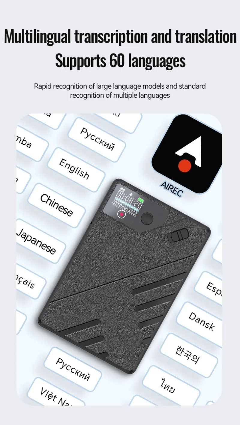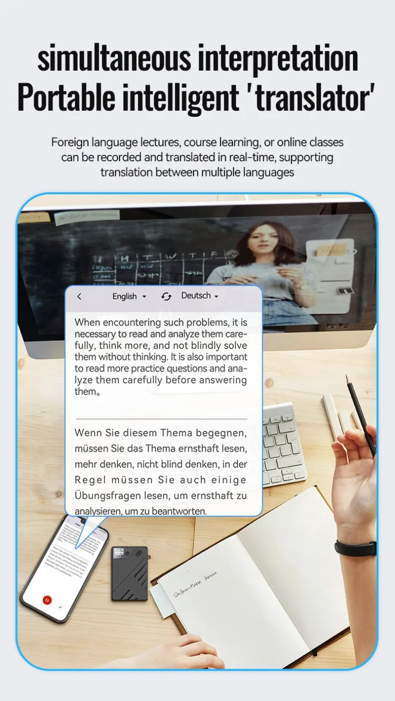 **Simultaneous Interpretation: A portable smart “translator” supporting real-time translation between multiple languages. Whether you are attending a foreign language lecture or an international online course, language barriers will become a thing of the past. It supports 60 languages to meet various language needs.