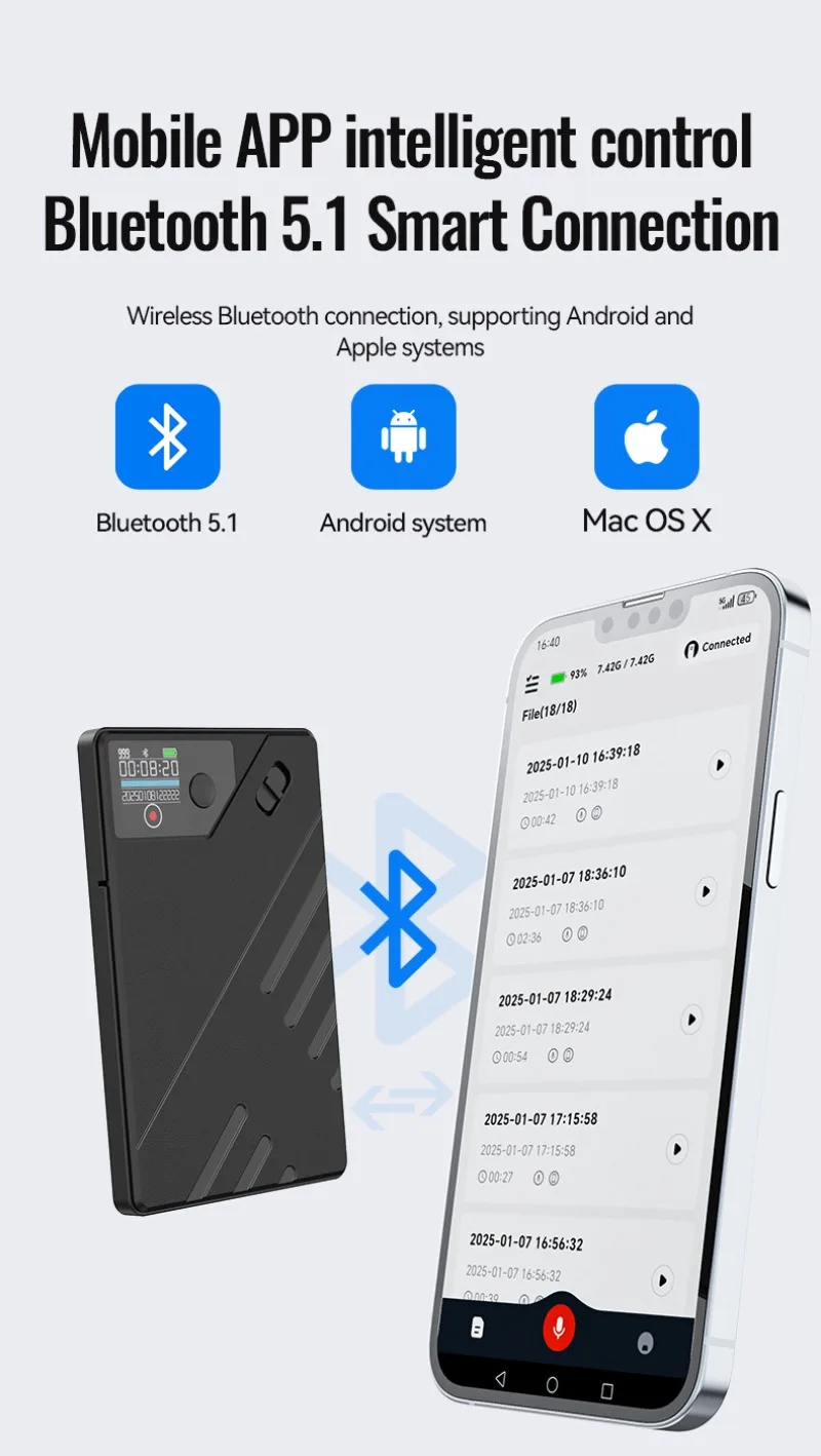 **Mobile App Control: Connects wirelessly to your Android or Apple device via Bluetooth 5.1. Easily control the recorder, manage files, and access recordings through the mobile app.