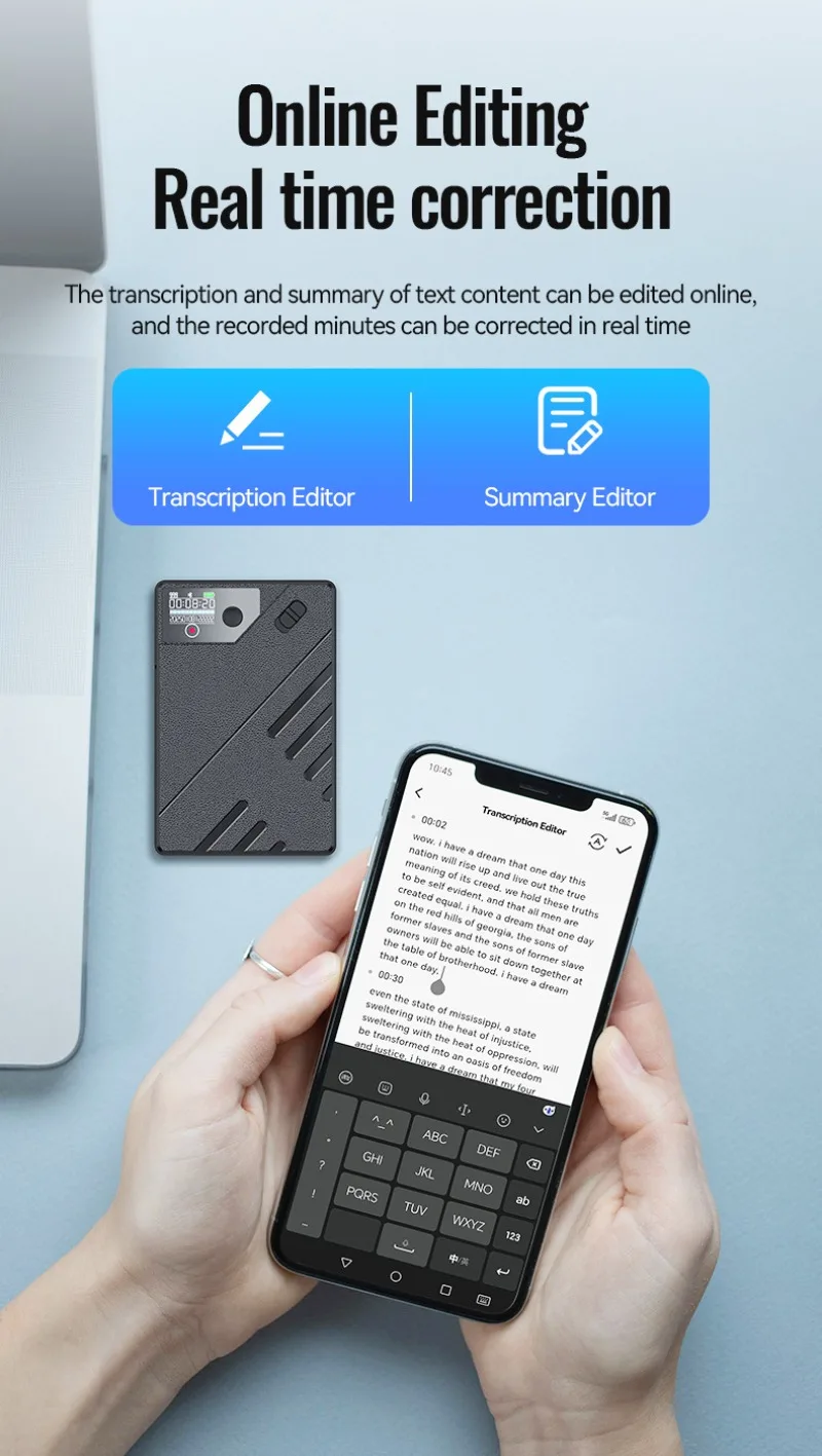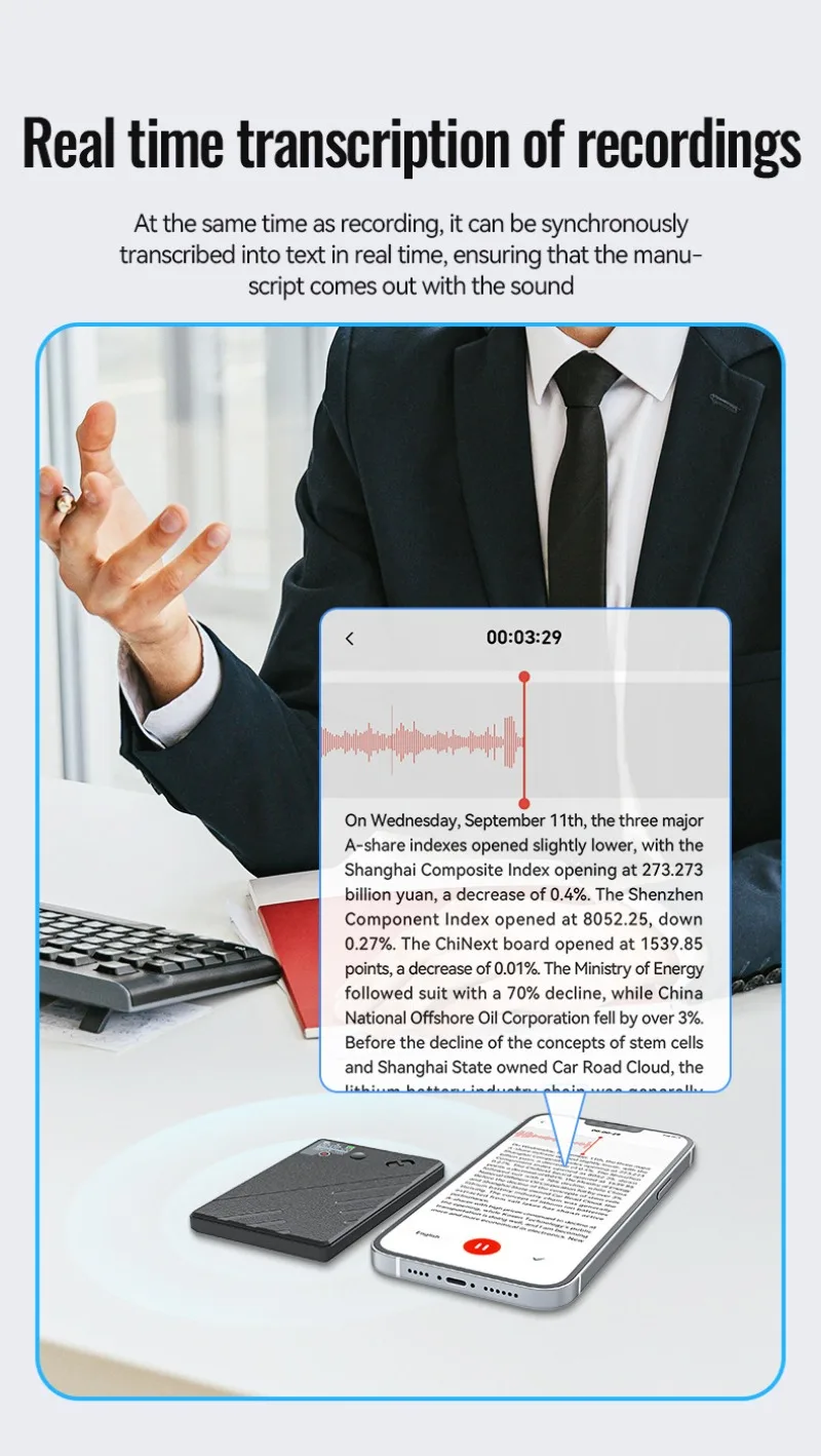 **Real-time Transcription: Records and transcribes simultaneously. No need for manual note-taking; text is generated while recording. Ideal for quickly recording important information in business meetings or academic lectures.