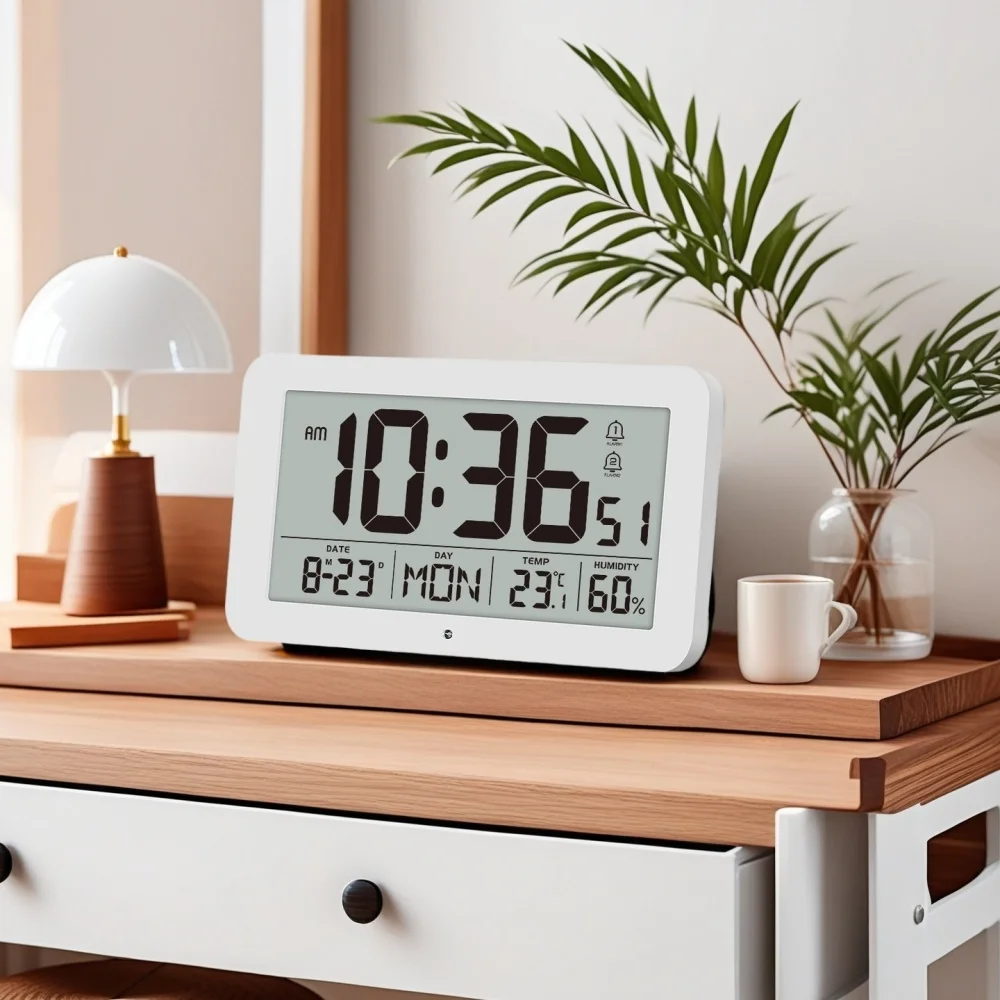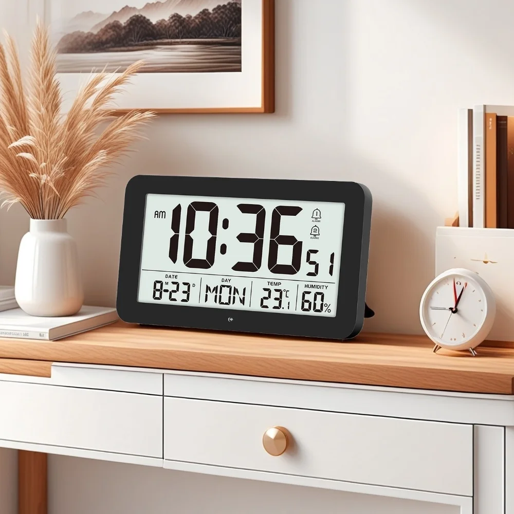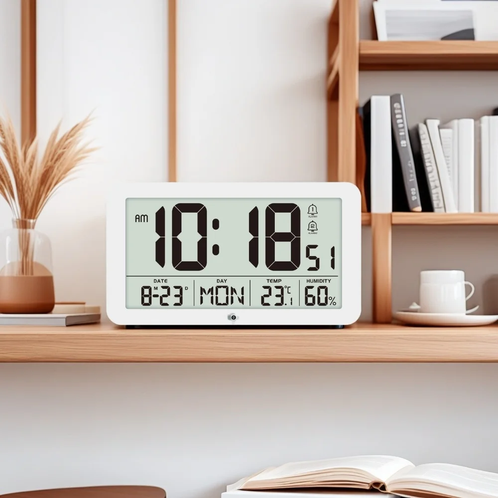 Minutes. Seconds. Date and day of the week. Temperature. Humidity display on the same screen