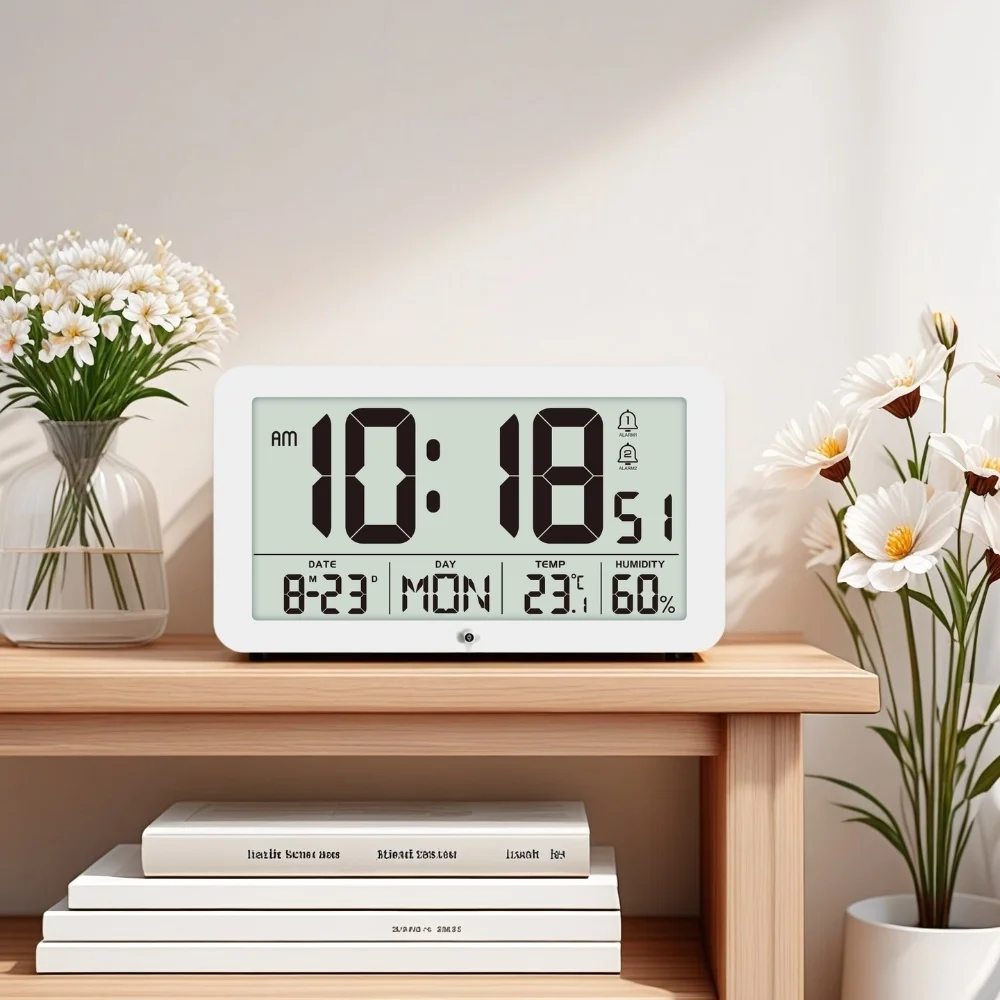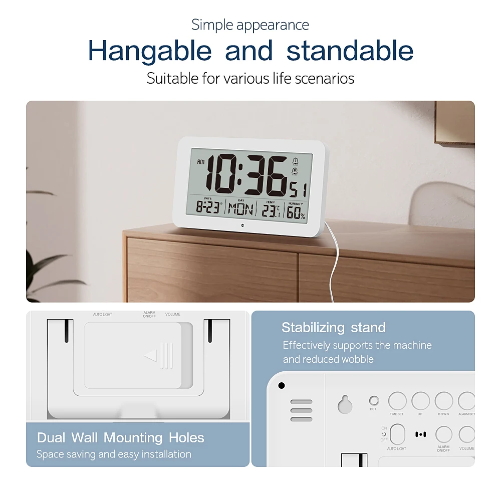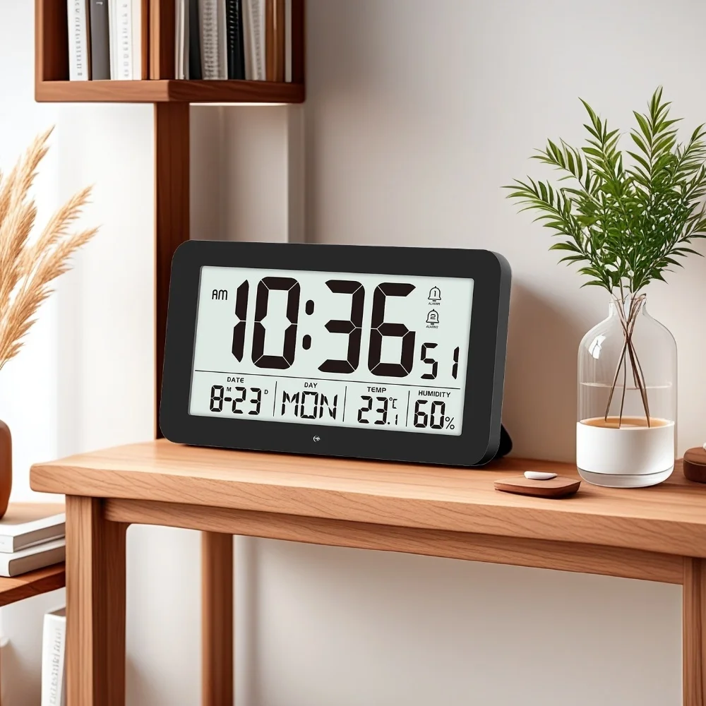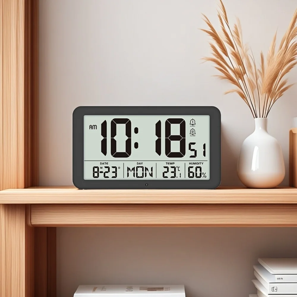 Minutes. Seconds. Date and day of the week. Temperature. Humidity display on the same screen