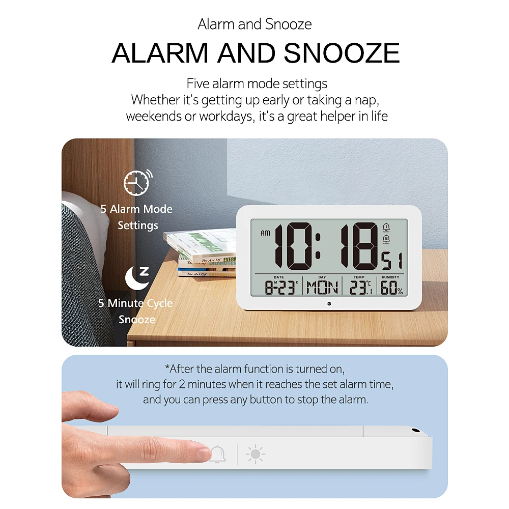 Press “Snooze/Backlight” key to snooze for 5 minutes when alarm rings