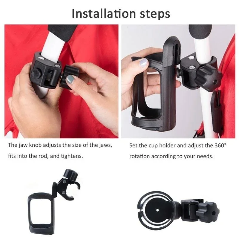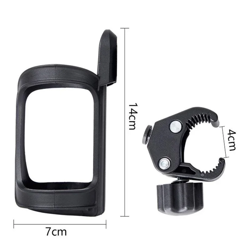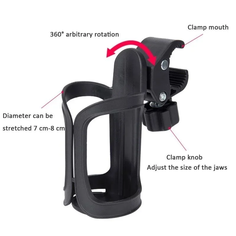 Material: PVCMaximum diameter of the jaw: 4cm / 1.57insize: 14 * 7cm / 5.5 * 2.7inopening diameter: 6-8cm / 2.36-3.15inFeature:1,cup Holder can be rotated 360 degrees It can be fitted on handle bar, under seat, down tube, fork, front pipe, can be used on most strollers.2,Lightweight and Simple to install, you can get it ready without any tools.3,Designed to keep the cup secure and safe from spills.4,Perfect for mountain bike, bicycle, wheelchairs , walker as well. Designed to fit most coffee cups and water bottles.5,Bottle holder is very strong in toughness, stretch and elasticity,The initial 7cm (2.7 in) caliber can be extended to 8.5 cm (3.3 in).Package includes:Pack of 1(1PC) * Bottle holder