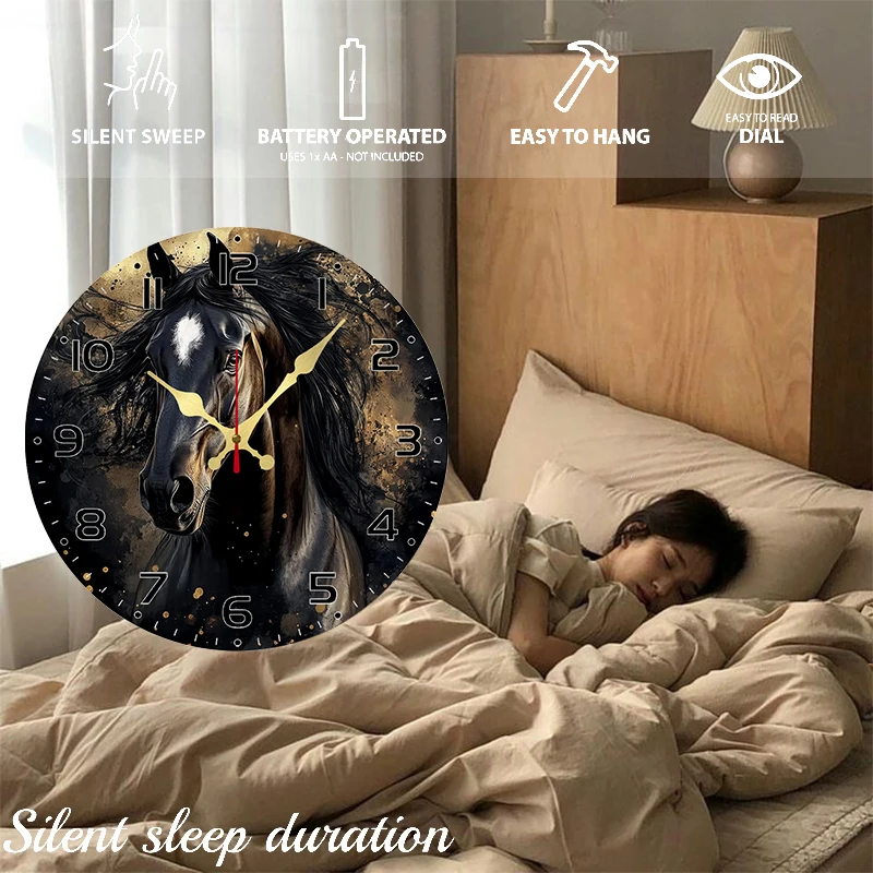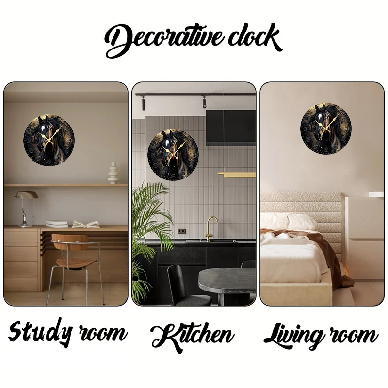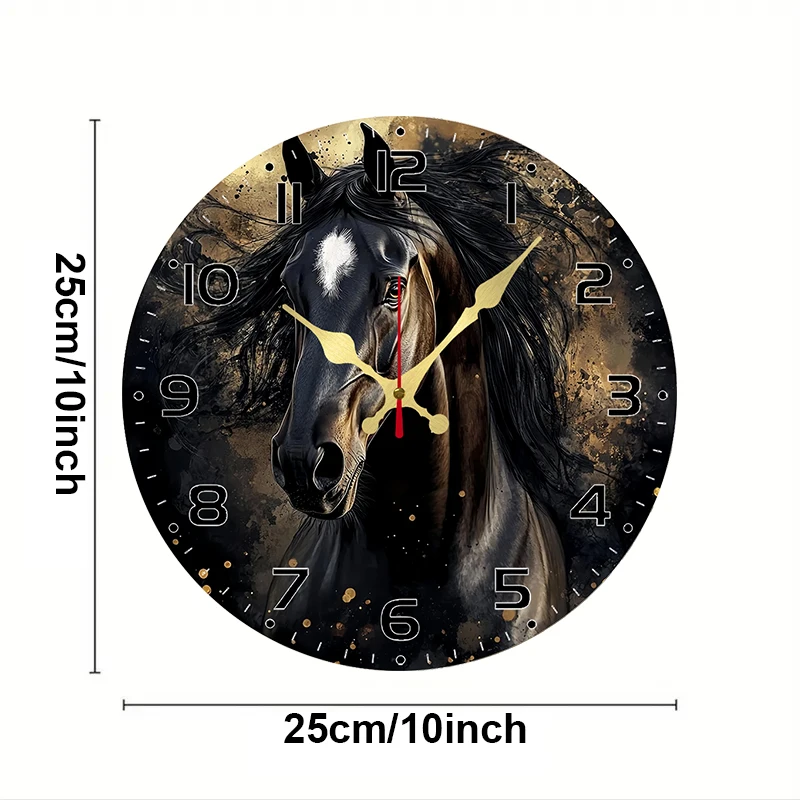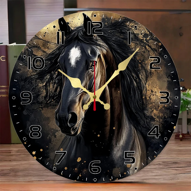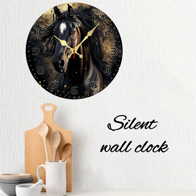 Black Horse Wooden Round Silent Hanging Wall Clock, Suitable For Living Room, Office, Study Room, Bedroom, Home Decoration