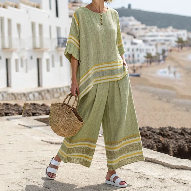 Be the first to review “Casual Versatile Striped Printed 2 Piece Sets Fashion O Neck Short Sleeve Pullover Top Color Spelling High Waist Long Pant Suit”