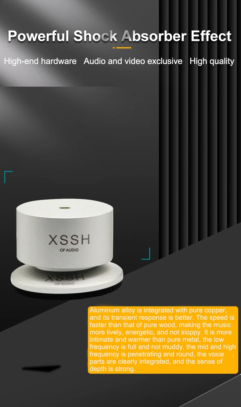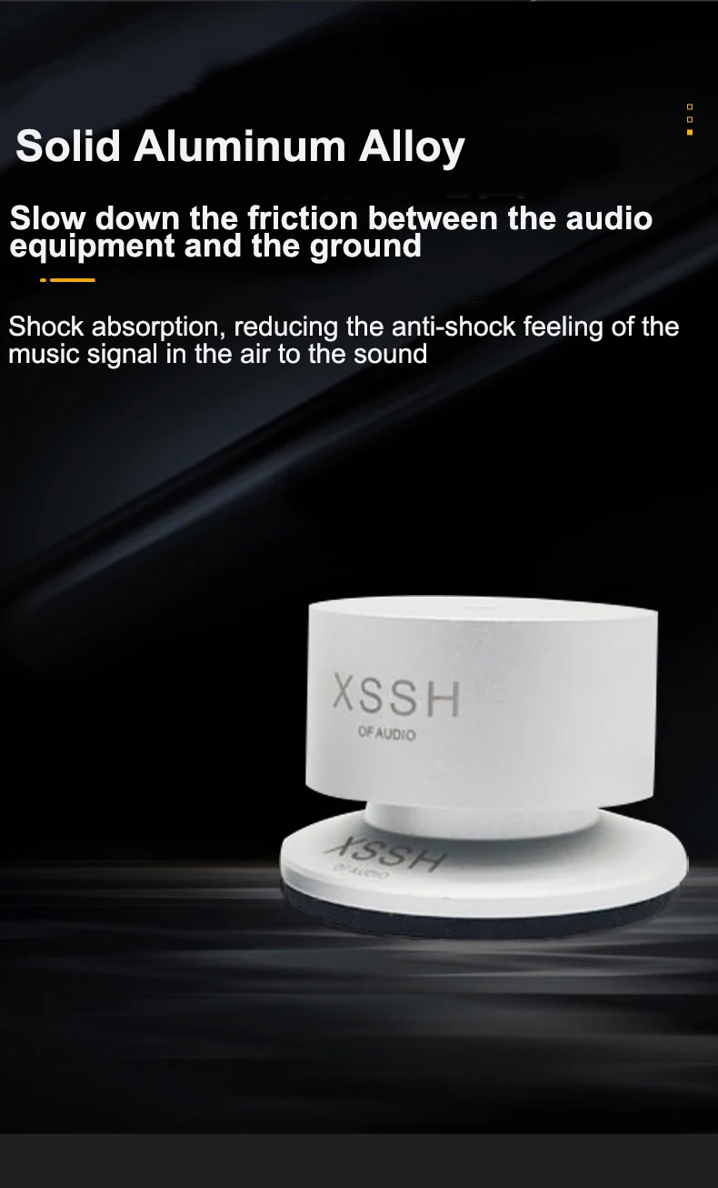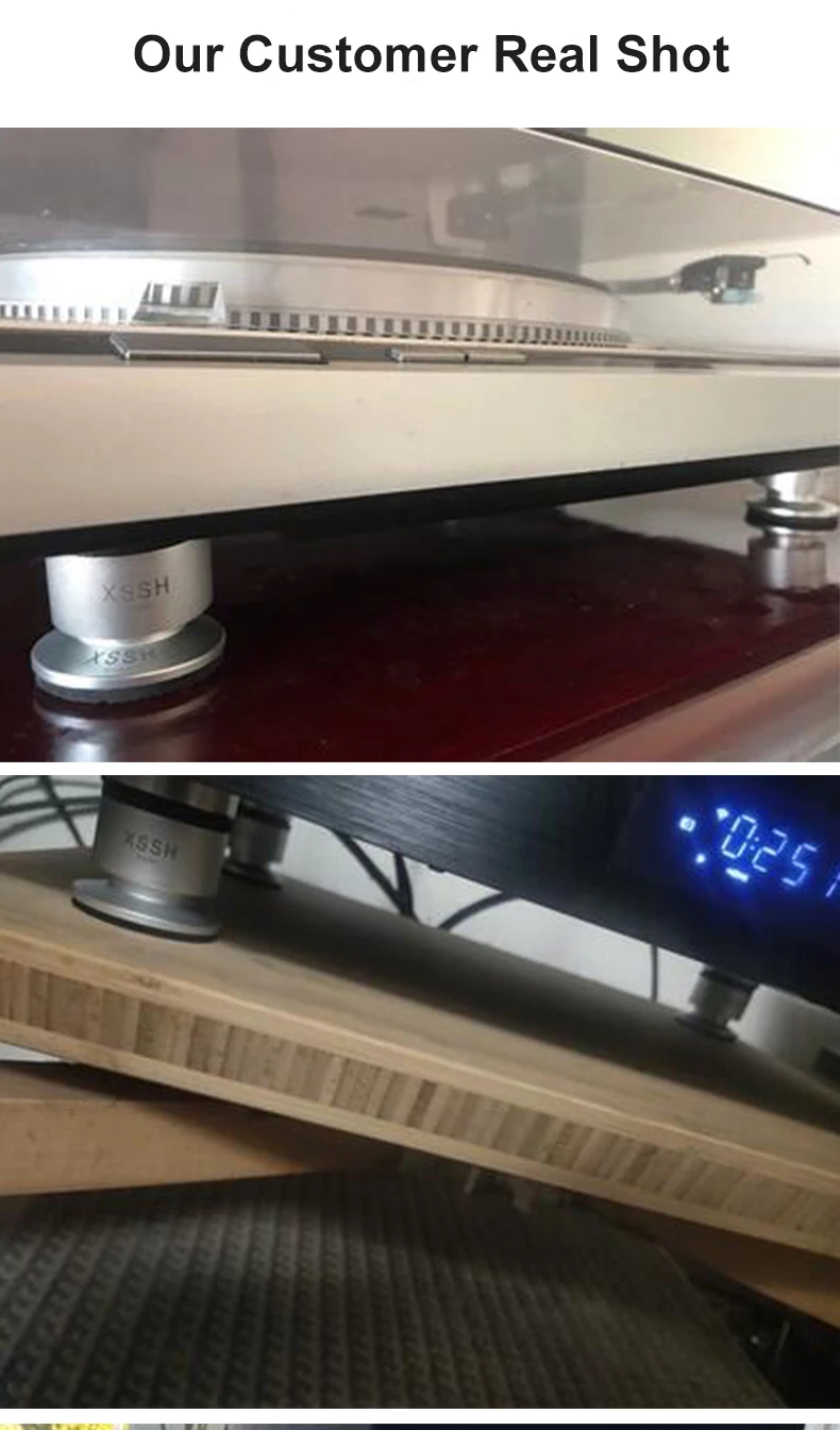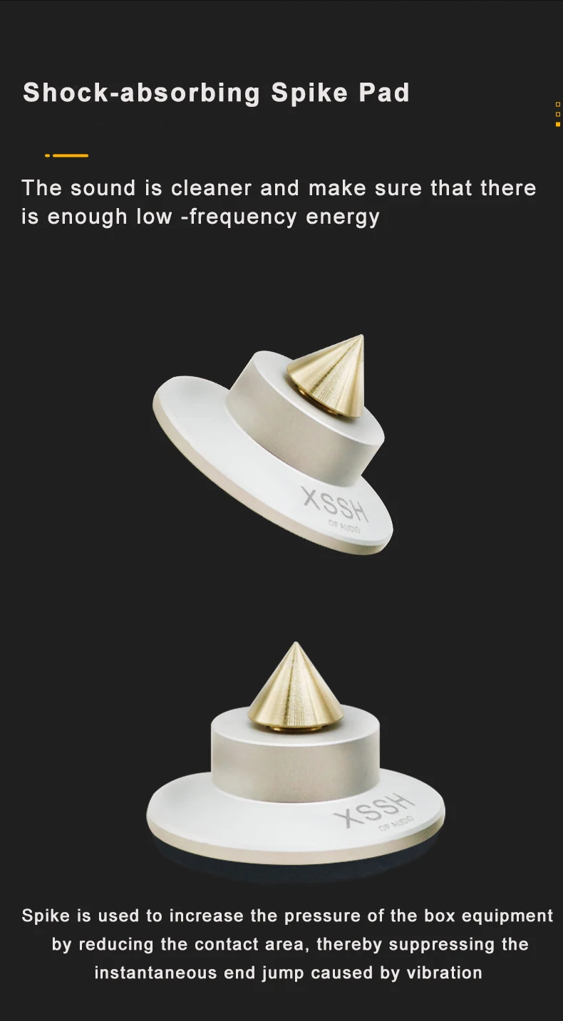 Materials: ① Aluminum alloy: with high hardness and density has low harmonic vibration point and high damping; ② Antiskid rubber: absorbing vibration and achieve higher quanlity of listening pleasure, improve sound clarity, stereo imaging and bass response