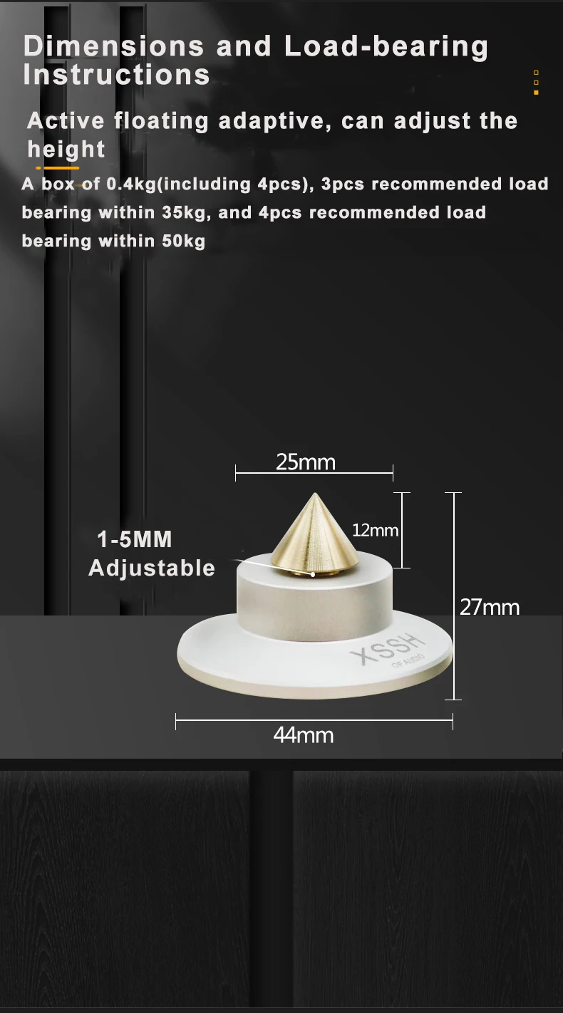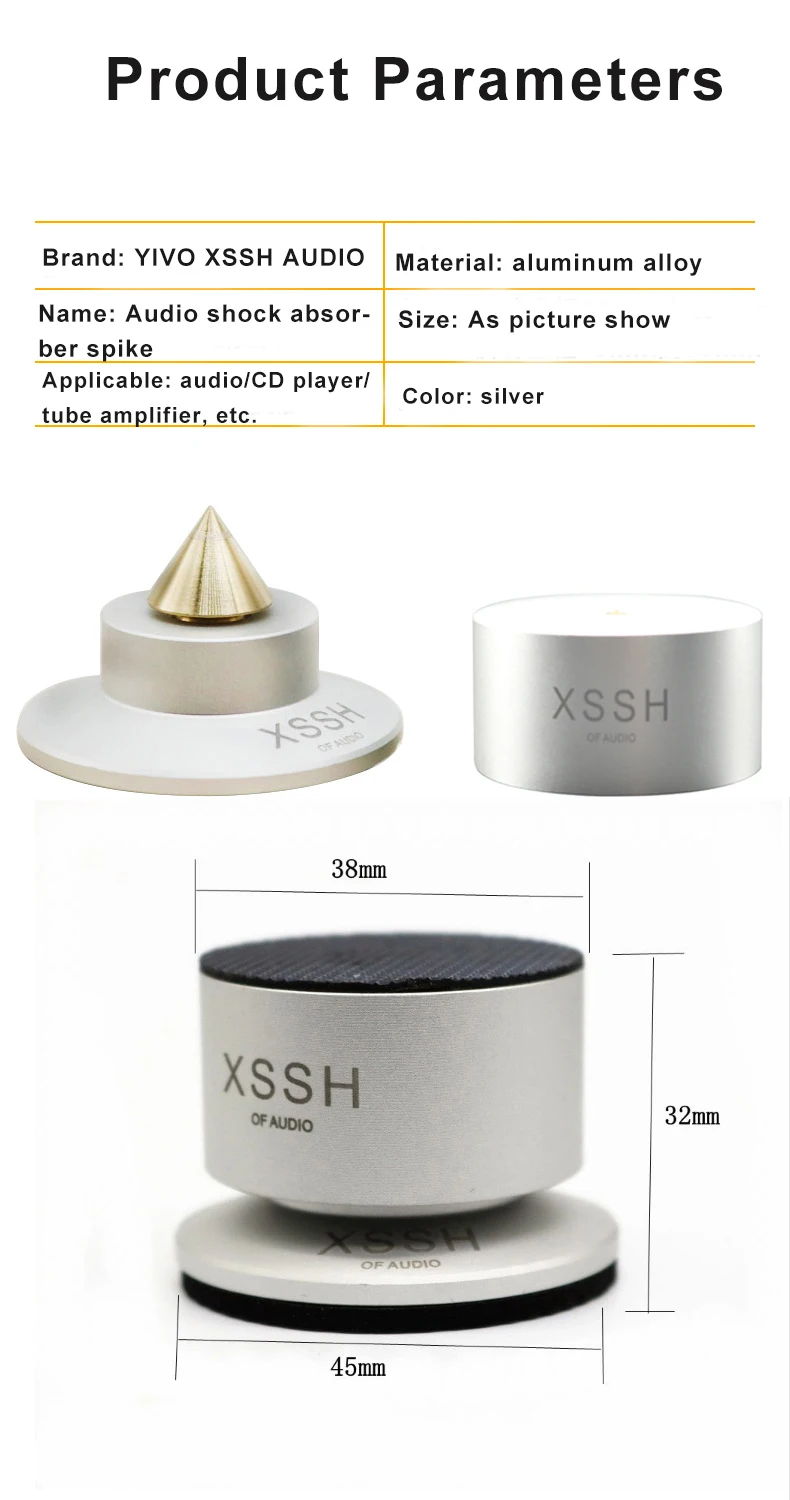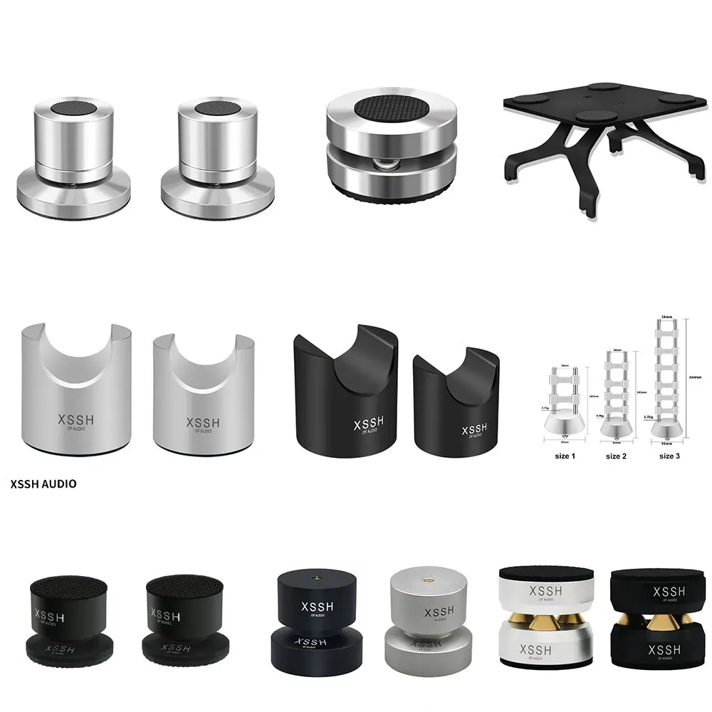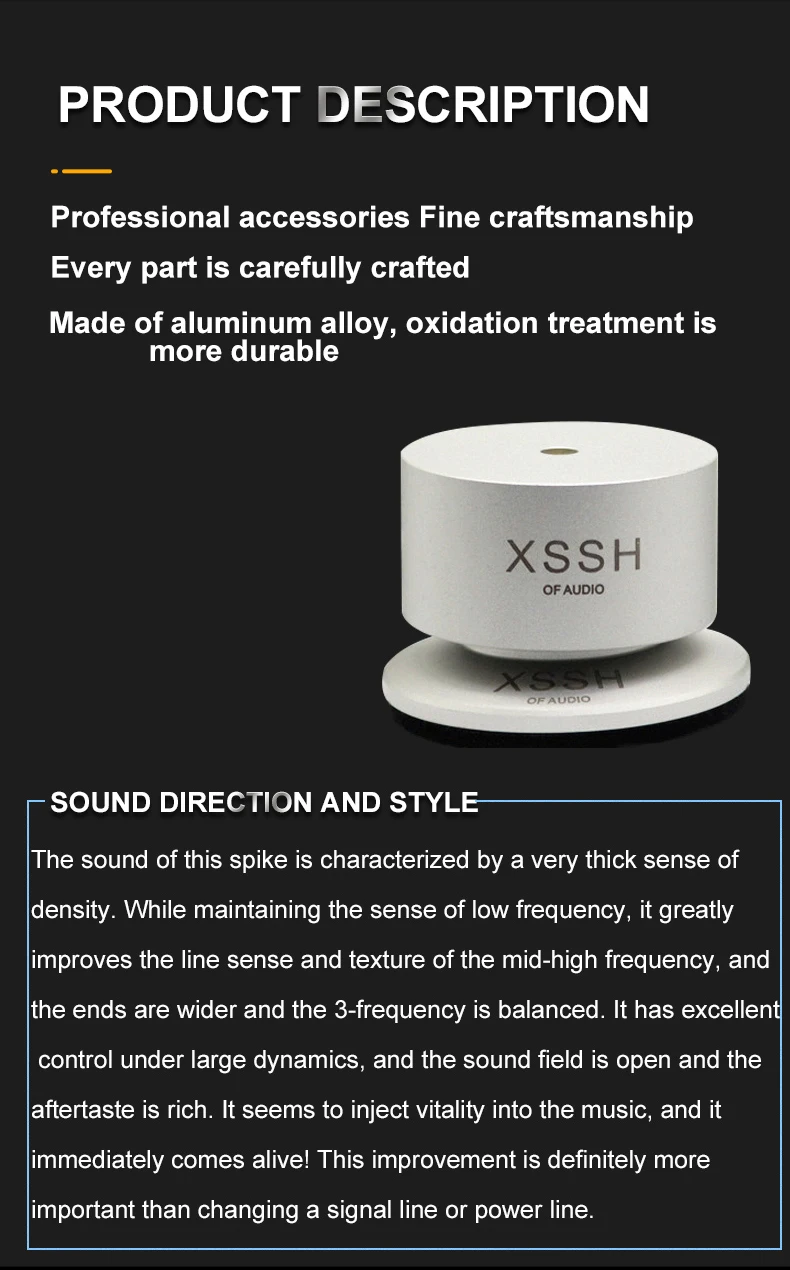 Materials: ① Aluminum alloy: with high hardness and density has low harmonic vibration point and high damping; ② Antiskid rubber: absorbing vibration and achieve higher quanlity of listening pleasure, improve sound clarity, stereo imaging and bass response