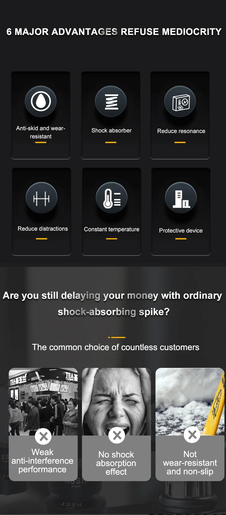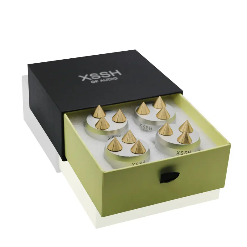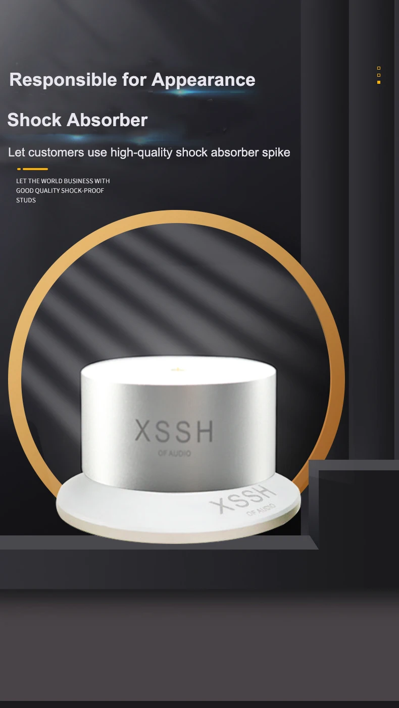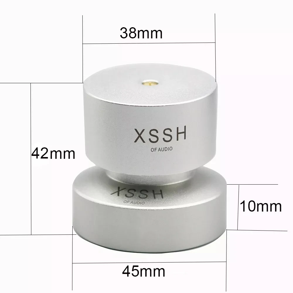 Materials: ① Aluminum alloy: with high hardness and density has low harmonic vibration point and high damping; ② Antiskid rubber: absorbing vibration and achieve higher quanlity of listening pleasure, improve sound clarity, stereo imaging and bass response