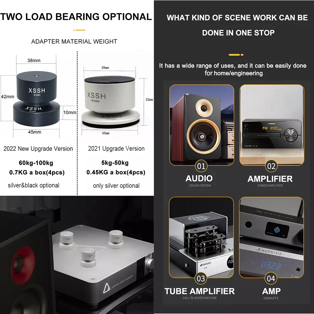 Design: CNC Machined and Antiskid Rubber isolation stand feet is easier to install, no need to make holes and no need to use double-sided adhesive to avoid damaging your equipment. Espeically it’s convenient for you to adjust load bearing by moving or adding springs which can make sound feeling different
