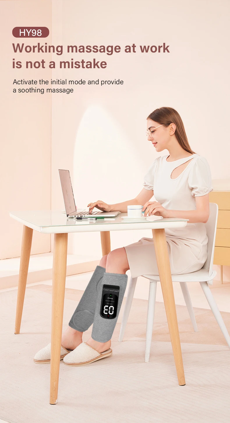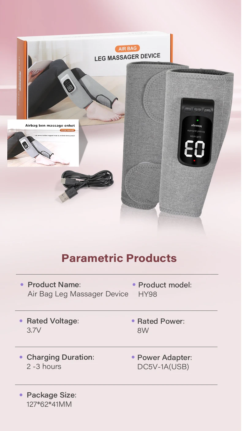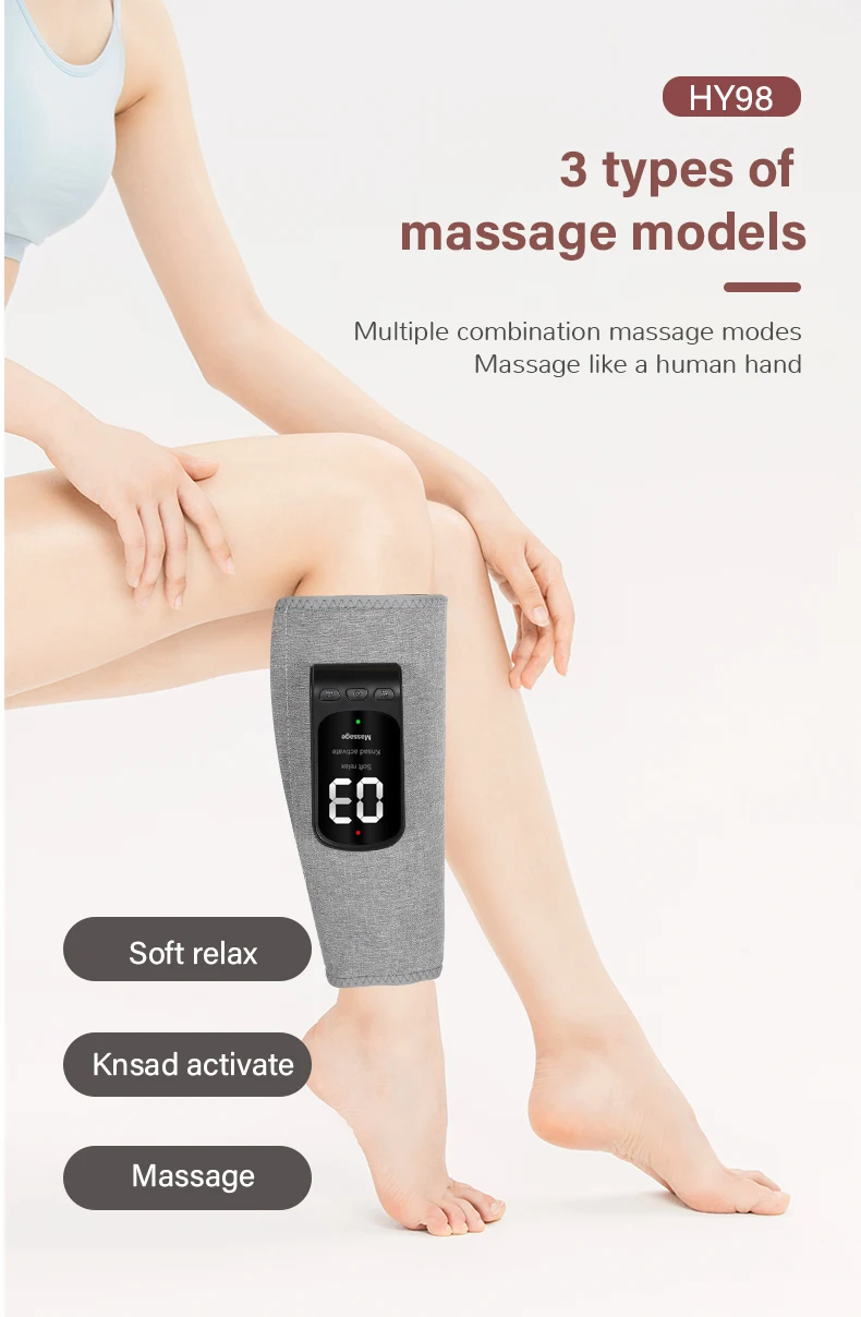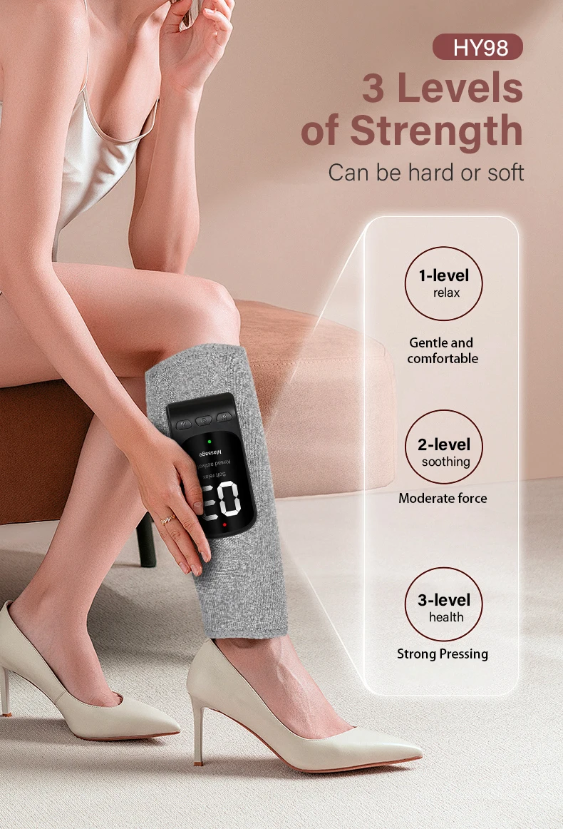 Short press the power button: Switch between leg soft mode, kneading relaxation mode,and massage mode.Short press the gear button: start airbag massage, switch between 1-3 levels of airbagstrength,display 01-03.Short press the temperature button: The red indicator light will turn on, and then short pressthe temperature button again to display H1-H3. The temperature corresponds to 40℃/ 45℃/50 ℃.