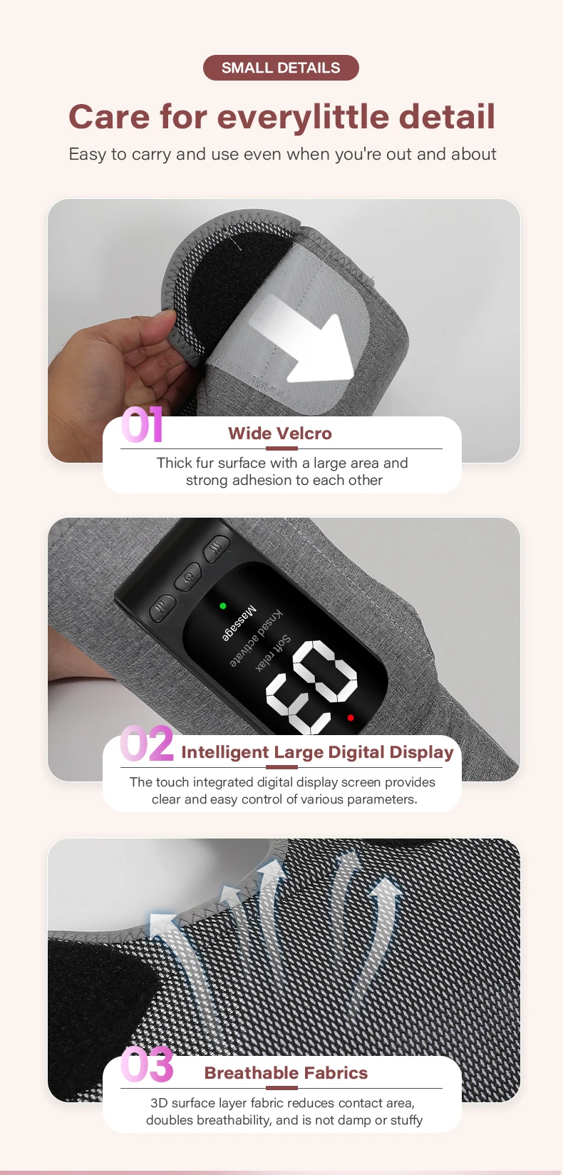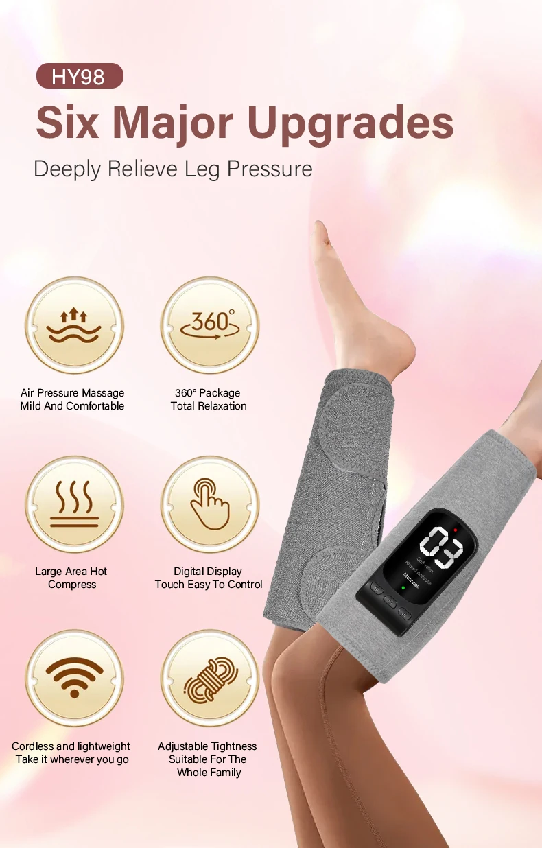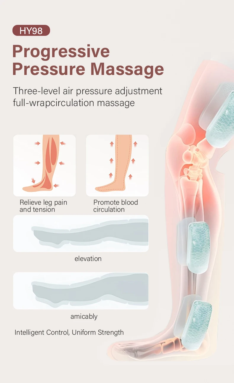 Short press the power button: Switch between leg soft mode, kneading relaxation mode,and massage mode.Short press the gear button: start airbag massage, switch between 1-3 levels of airbagstrength,display 01-03.Short press the temperature button: The red indicator light will turn on, and then short pressthe temperature button again to display H1-H3. The temperature corresponds to 40℃/ 45℃/50 ℃.