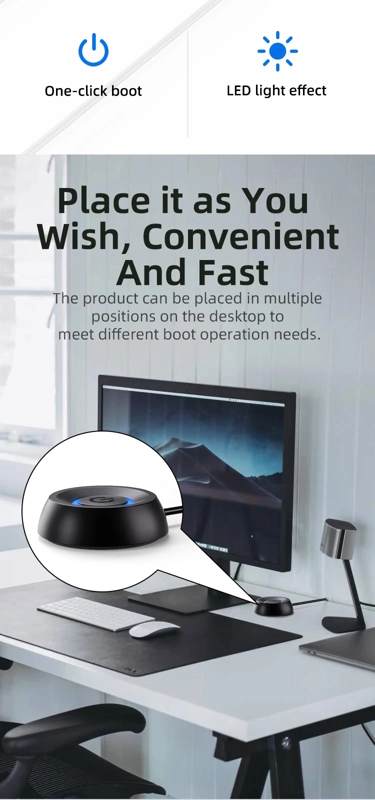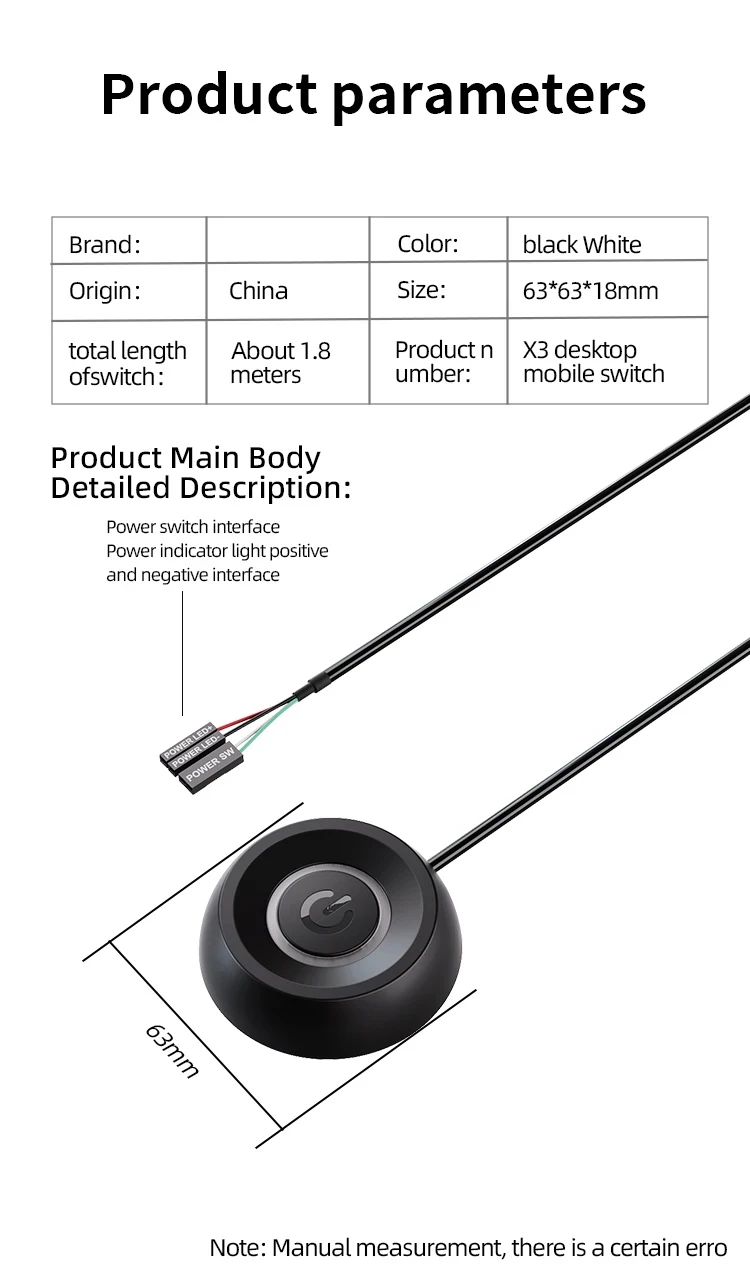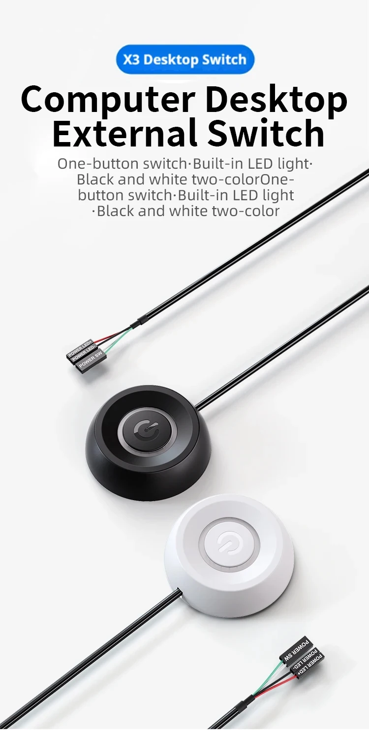 1. This product is a desktop mobile switch button, can be placed outside the desktop computer, next time no need to bend under the desk to find the switch, bringing the ultimate convenience.