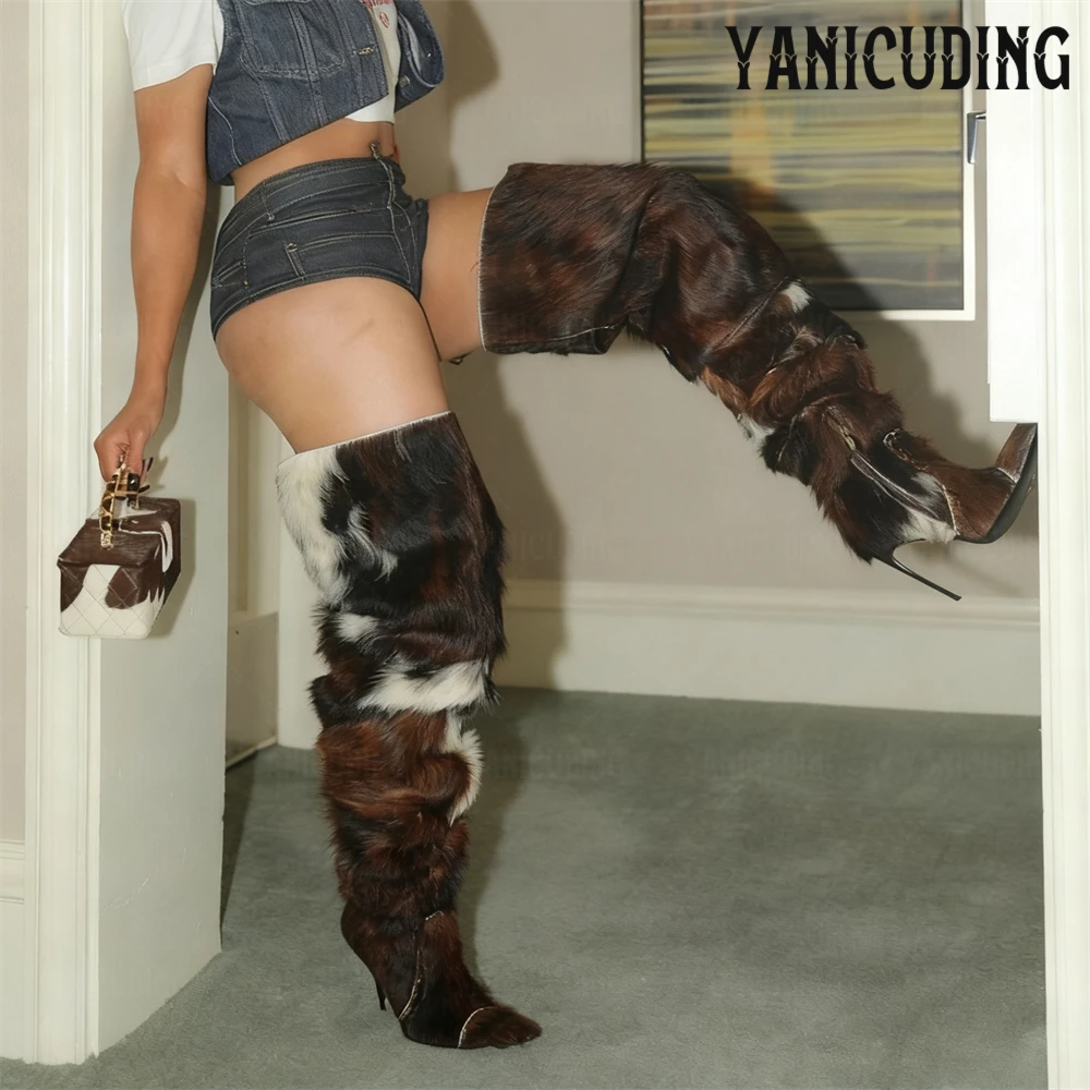Cowhide Furry Thigh High Boot Fashionable Black Rivet over the Knee Boots Designer Style Pointed Toe Stiletto Boots for Women