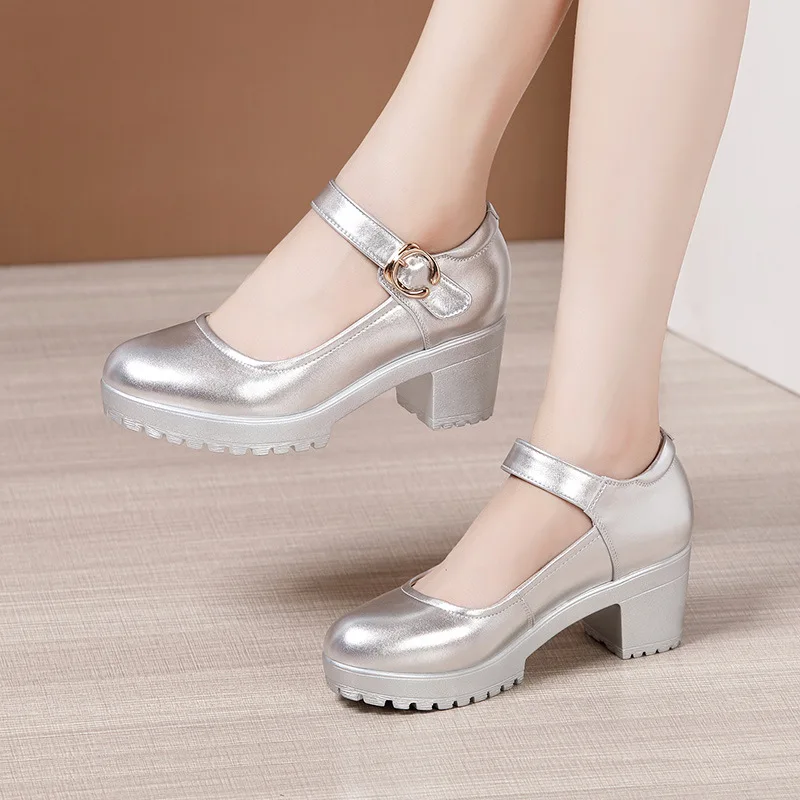 Cowhide high heels women’s platform round toe Shallow mouth work shoes women’s single shoes girls leather shoes large size