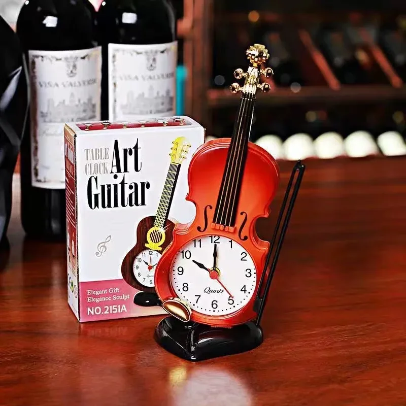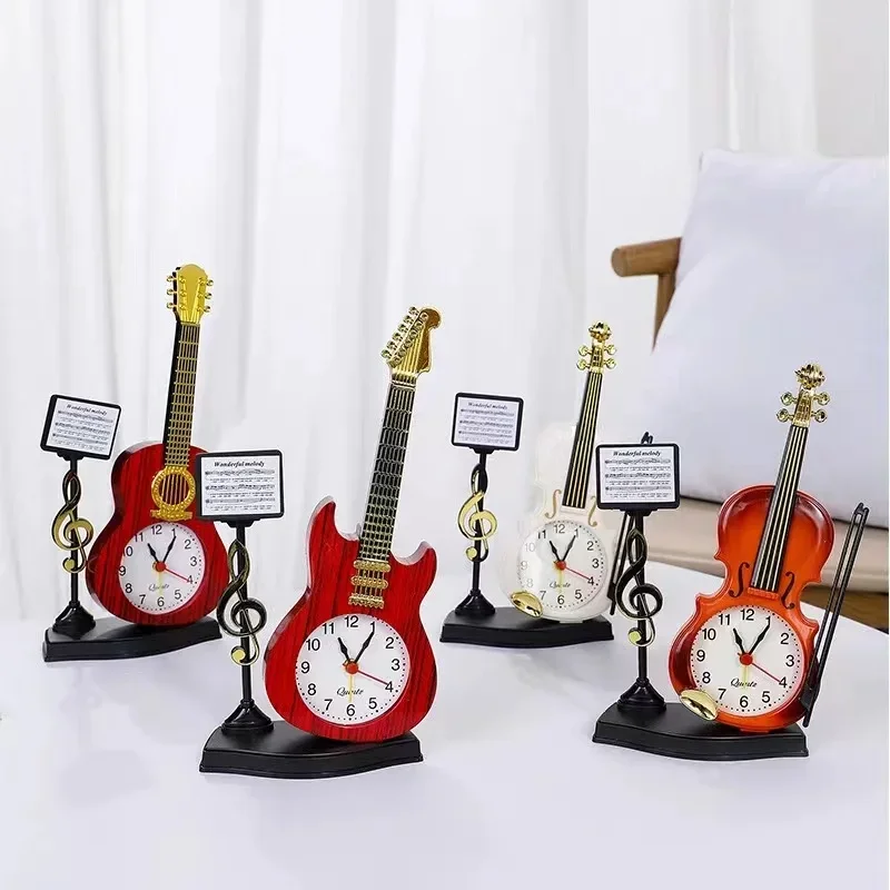 Desk Alarm Clock Vintage Desk Clock Guitar Shape Stable Base Battery Powered ABS Alarm Clock with Pencil Holder for Bedroom