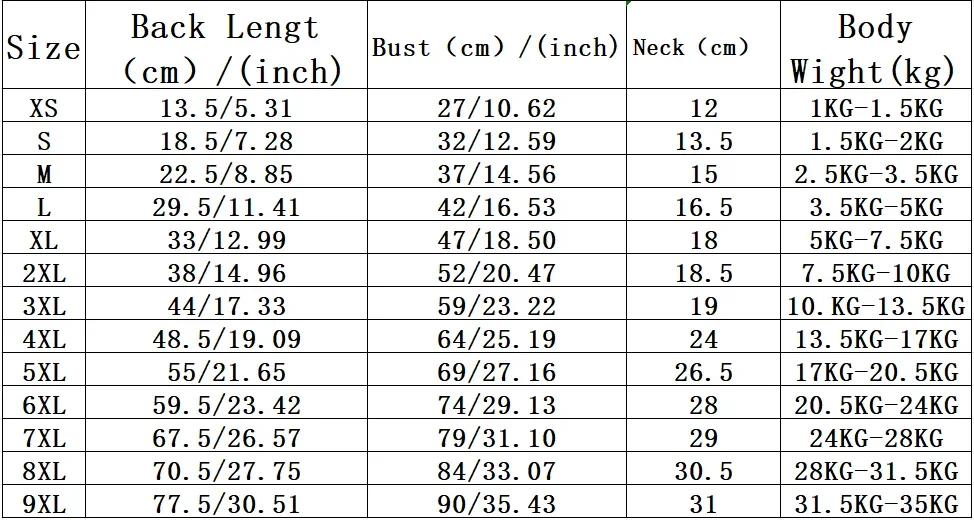 9XL-back length:77.5cm/30.51inch,bust:90cm/35.43inch,suit for pet weight:31.5-35kg