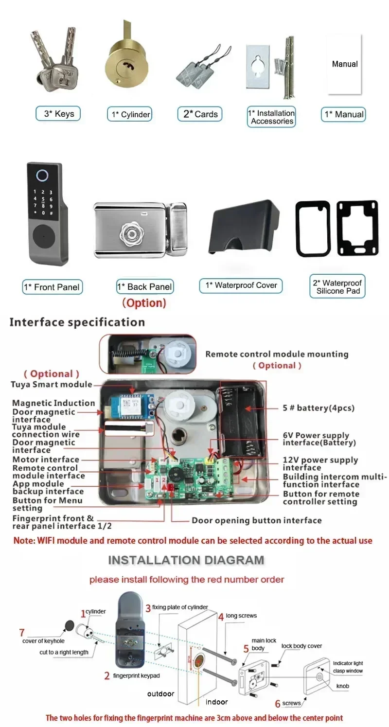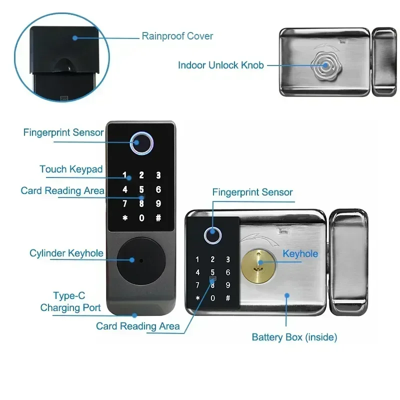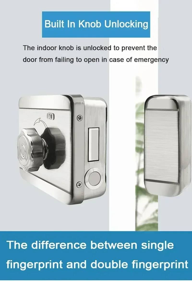 * Dual fingerprint design: both inside and outside the door support fingerprint, password, card swipe, and key unlocking. It is recommended to install it on the fence door, which can effectively prevent people outside the door from reaching into the inner door handle to unlock.