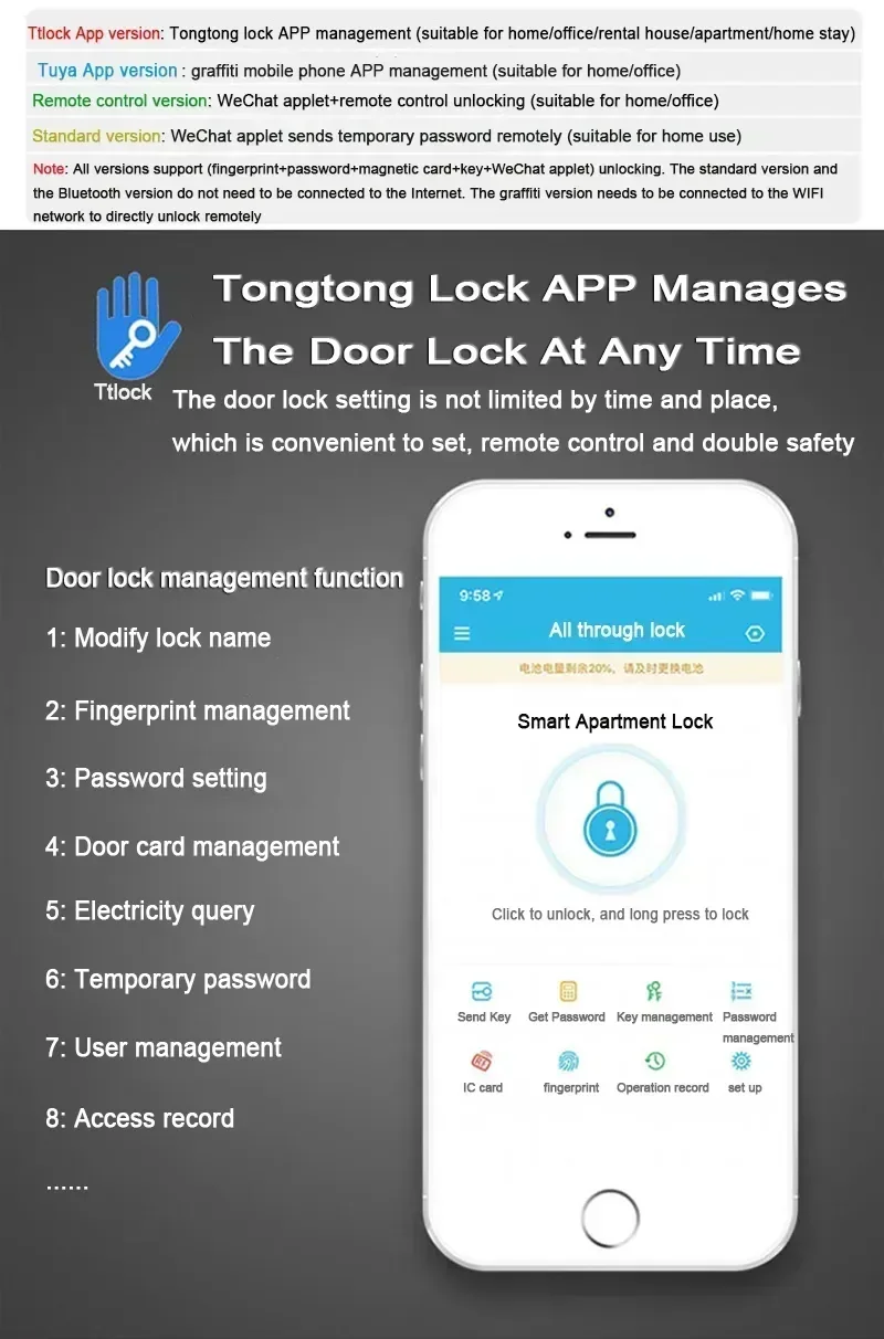 Unlocking method: support fingerprint/password/IC card/key/APP unlocking