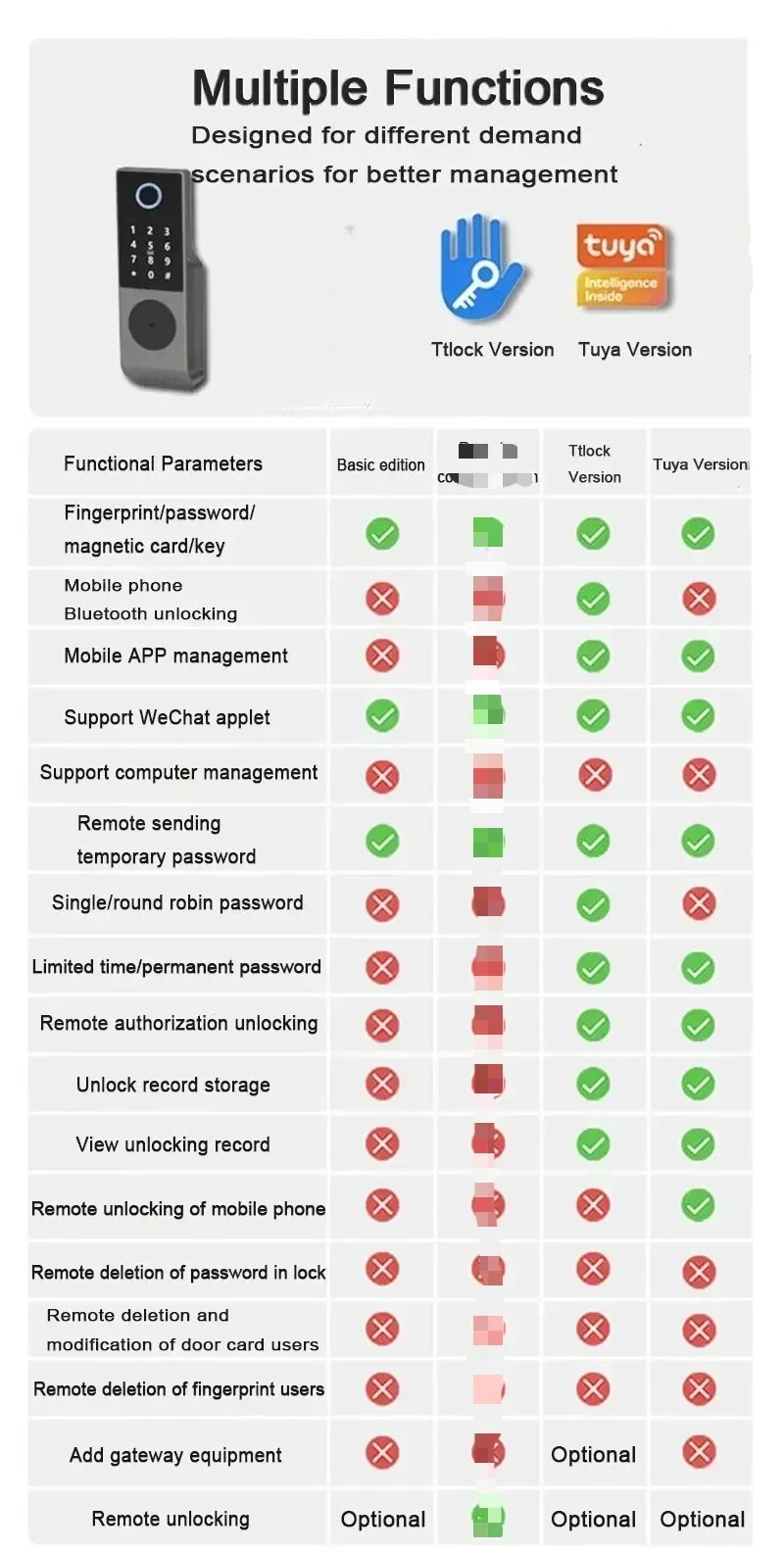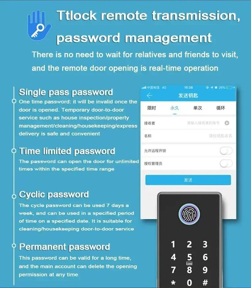* Function: Support mobile phone Bluetooth unlocking, mobile phone APP management, computer management, remote temporary password sending, single/cycle password, limited time/permanent password, remote authorization unlocking, unlocking record storage, unlocking record viewing.