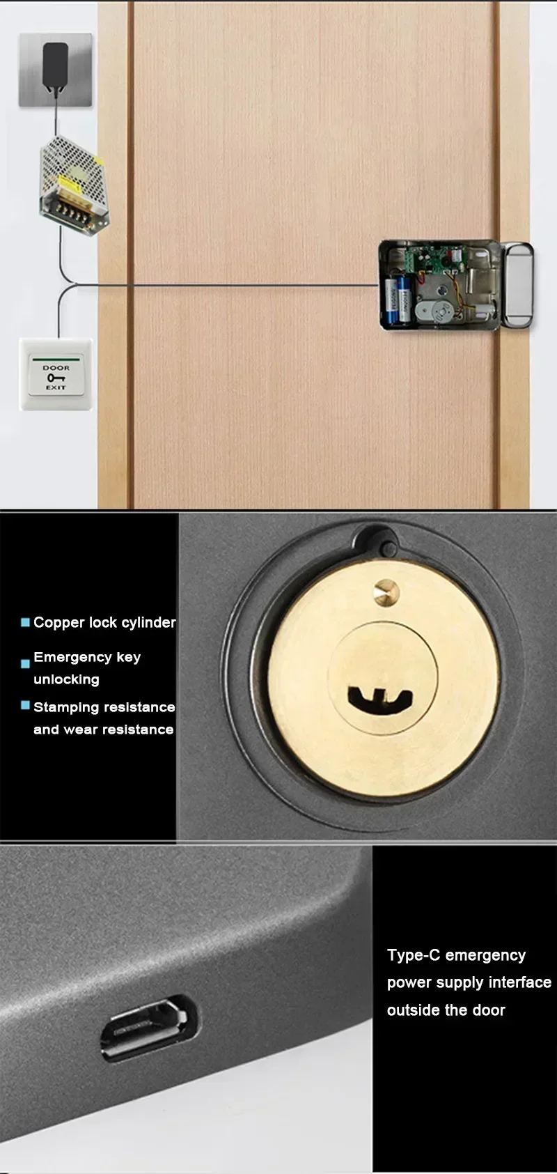 * Type-C emergency charging port outside the door, can unlock even if the power is off.