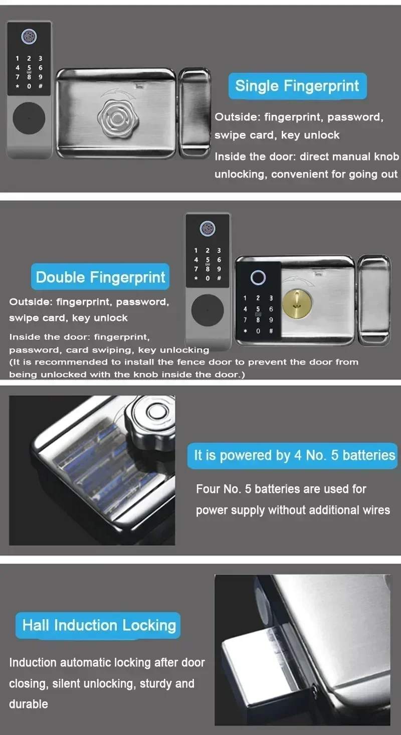 * Dual fingerprint design: both inside and outside the door support fingerprint, password, card swipe, and key unlocking. It is recommended to install it on the fence door, which can effectively prevent people outside the door from reaching into the inner door handle to unlock.