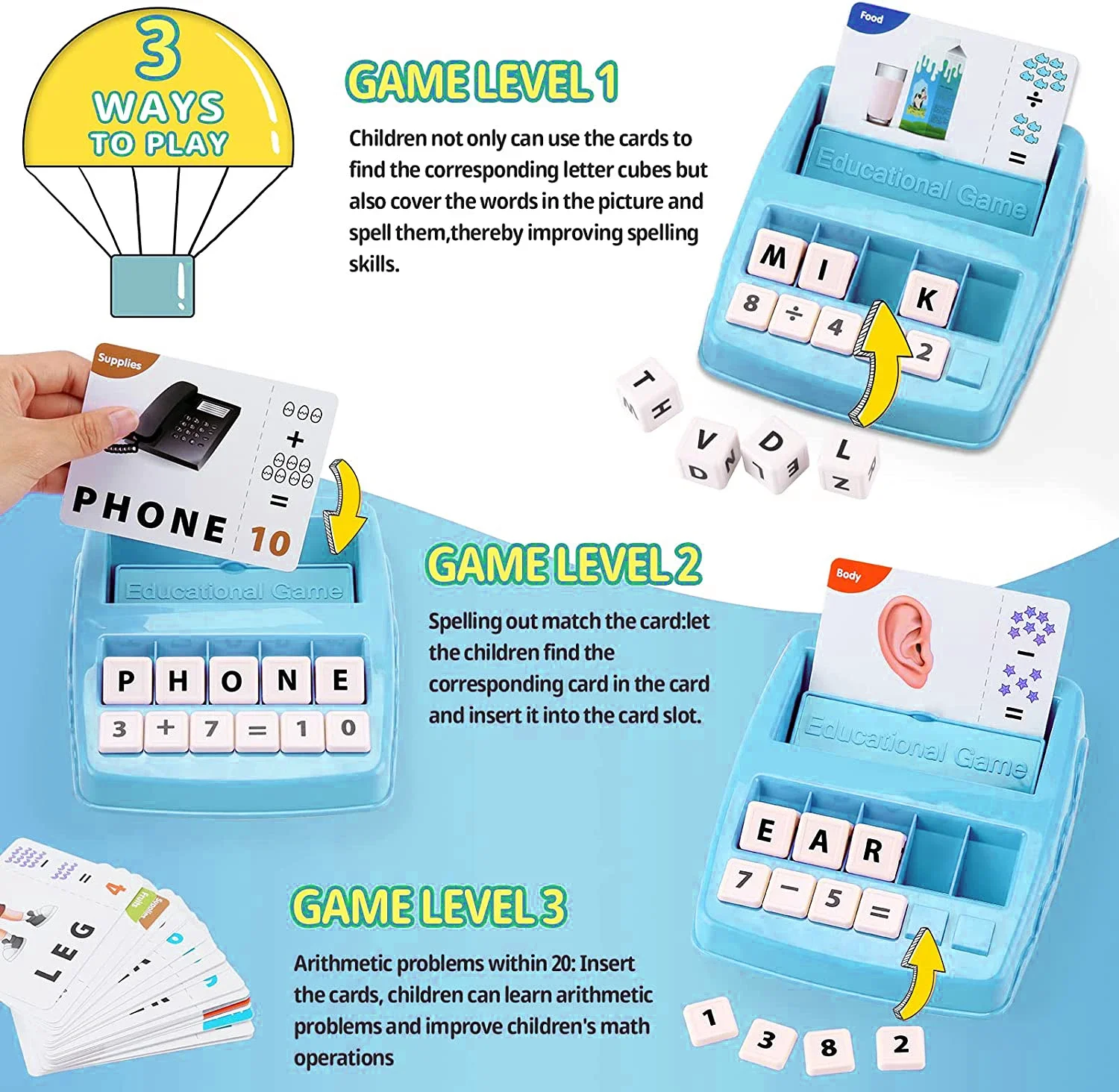 32 Cards (Double sides printed cards of 64 words & math questions)