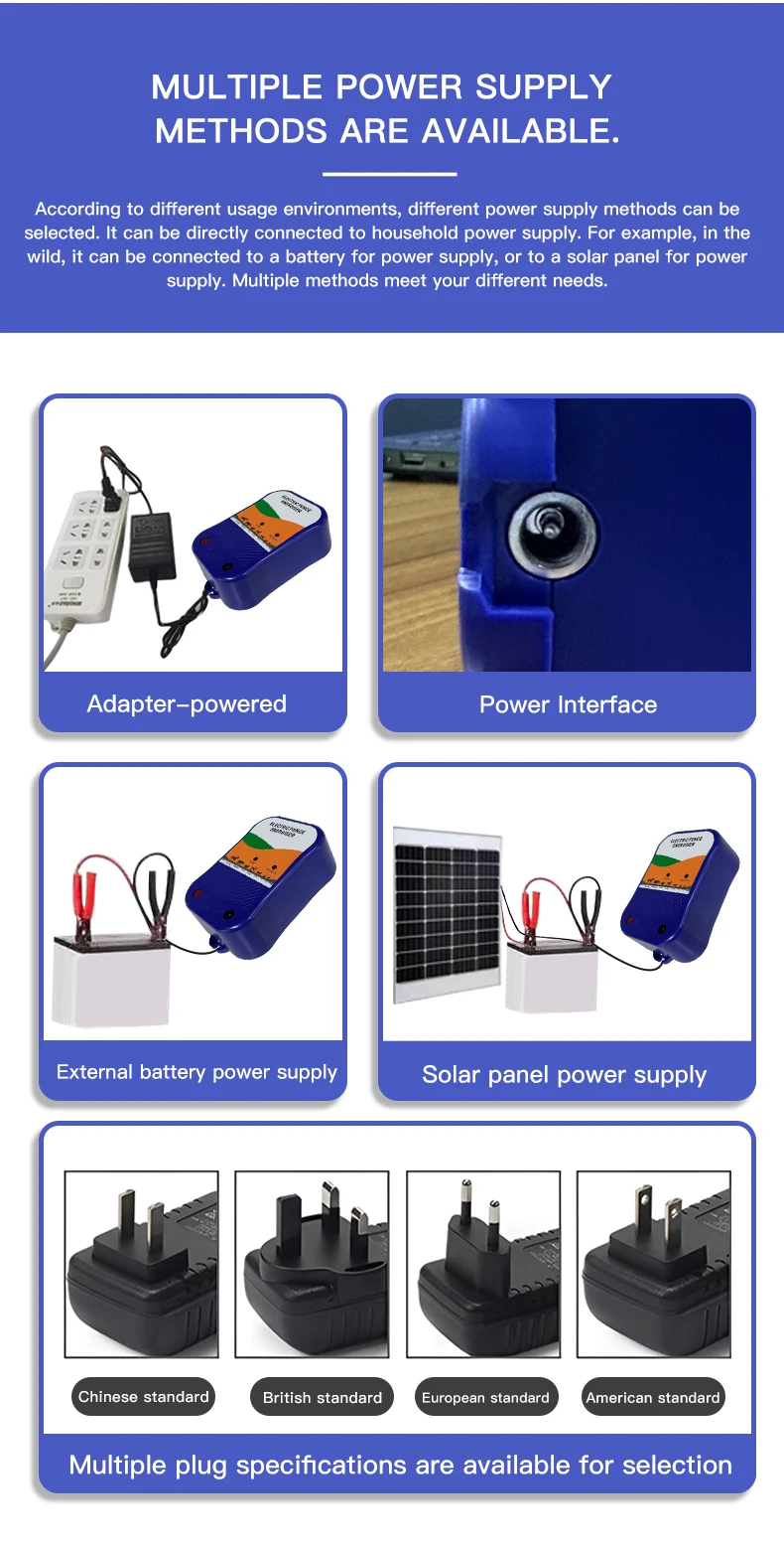 - Power supply: Main power, battery and solar panel