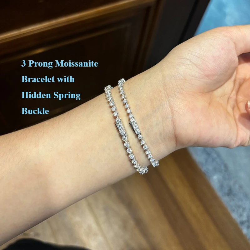3 Claw Full Moissanite Bracelet  — 2.5mm 0.06CT and 3mm 0.1CT Options with S925 Silver Hidden Spring Buckle