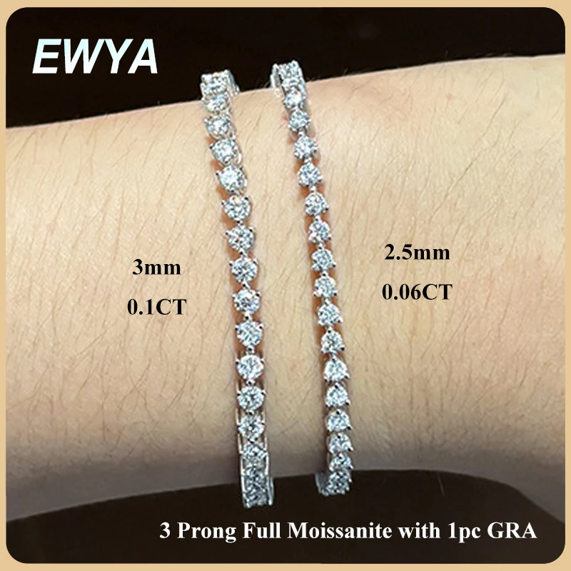 EWYA 3 Claw 2.5/3mm Full D Color Moissanite Diamond Tennis Bracelet Hidden Buckle for Women Man 925 Silver Link Chain Bracelets