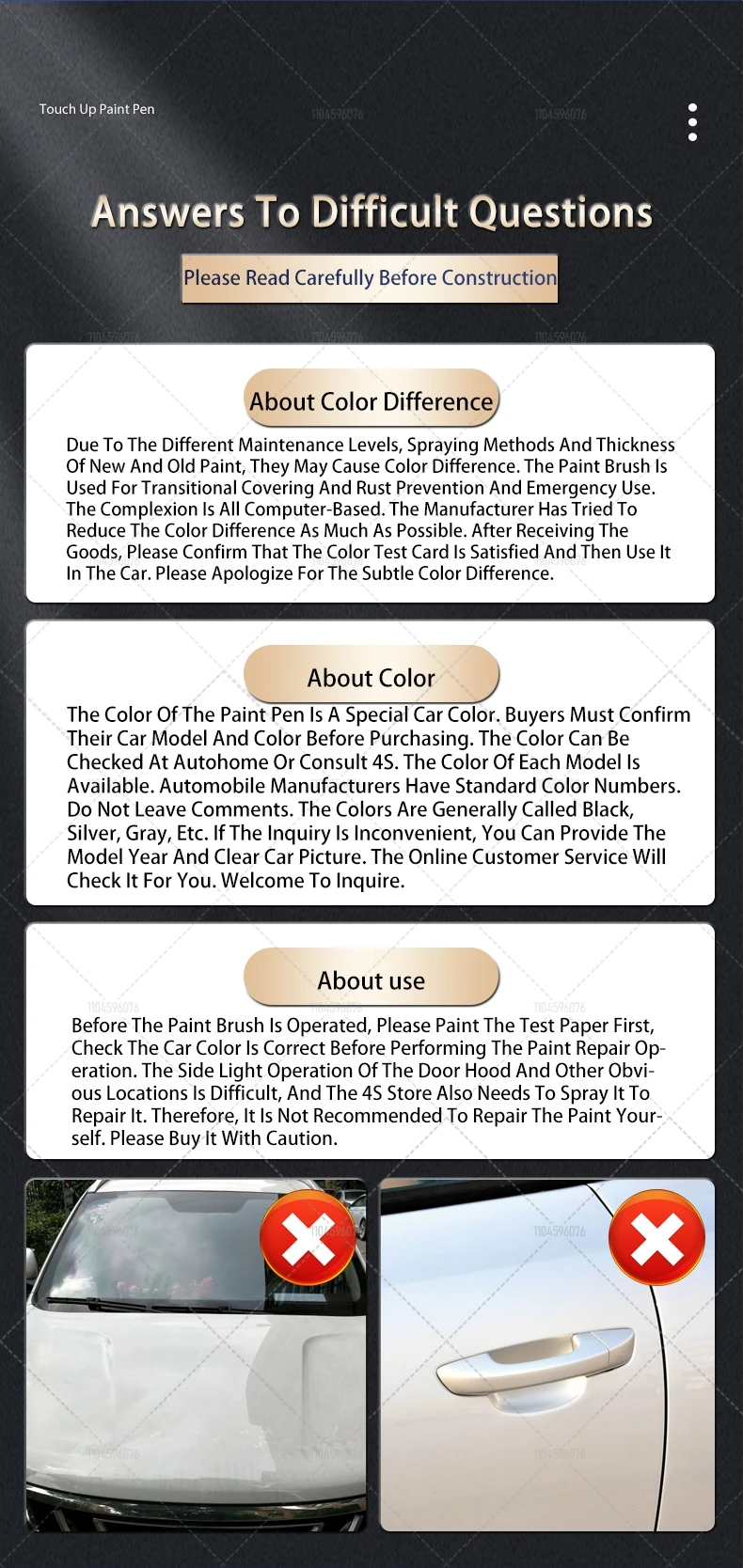 The brush coating method of this product can only repair small scars, especially metal paint. Due to the limitations of the brush coating method, the metal particles in the paint cannot be evenly dispersed, and there may be a certain color difference and the surface is not smooth.
