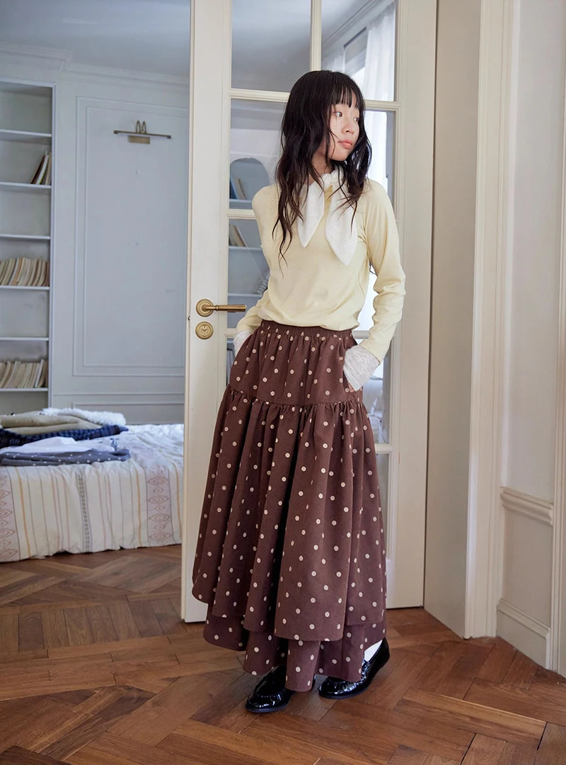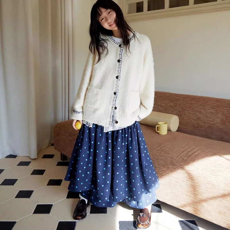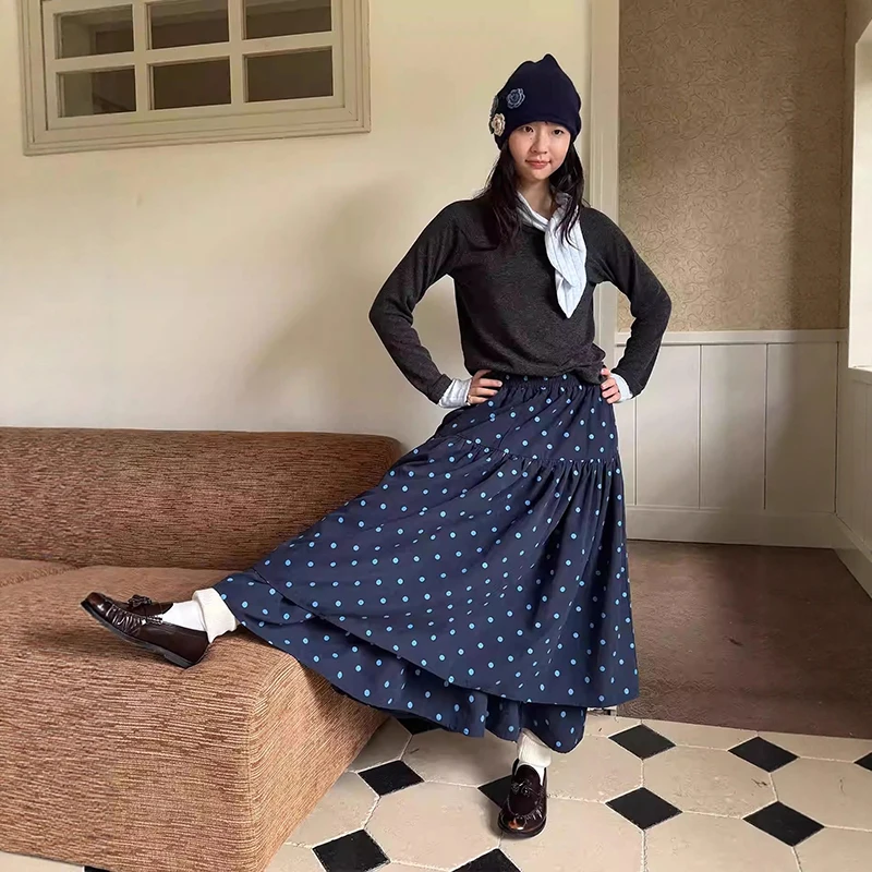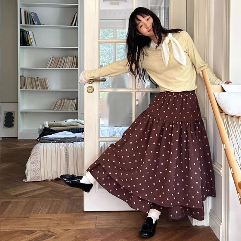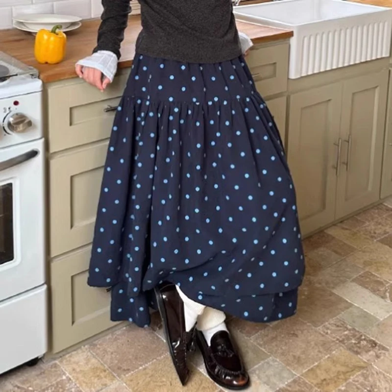 French Polka Dot Cake Skirts for Women Autumn Y2K Fashion High Waist Pleated Long Skirts Woman Loose Vintage Elegant Midi Skirt