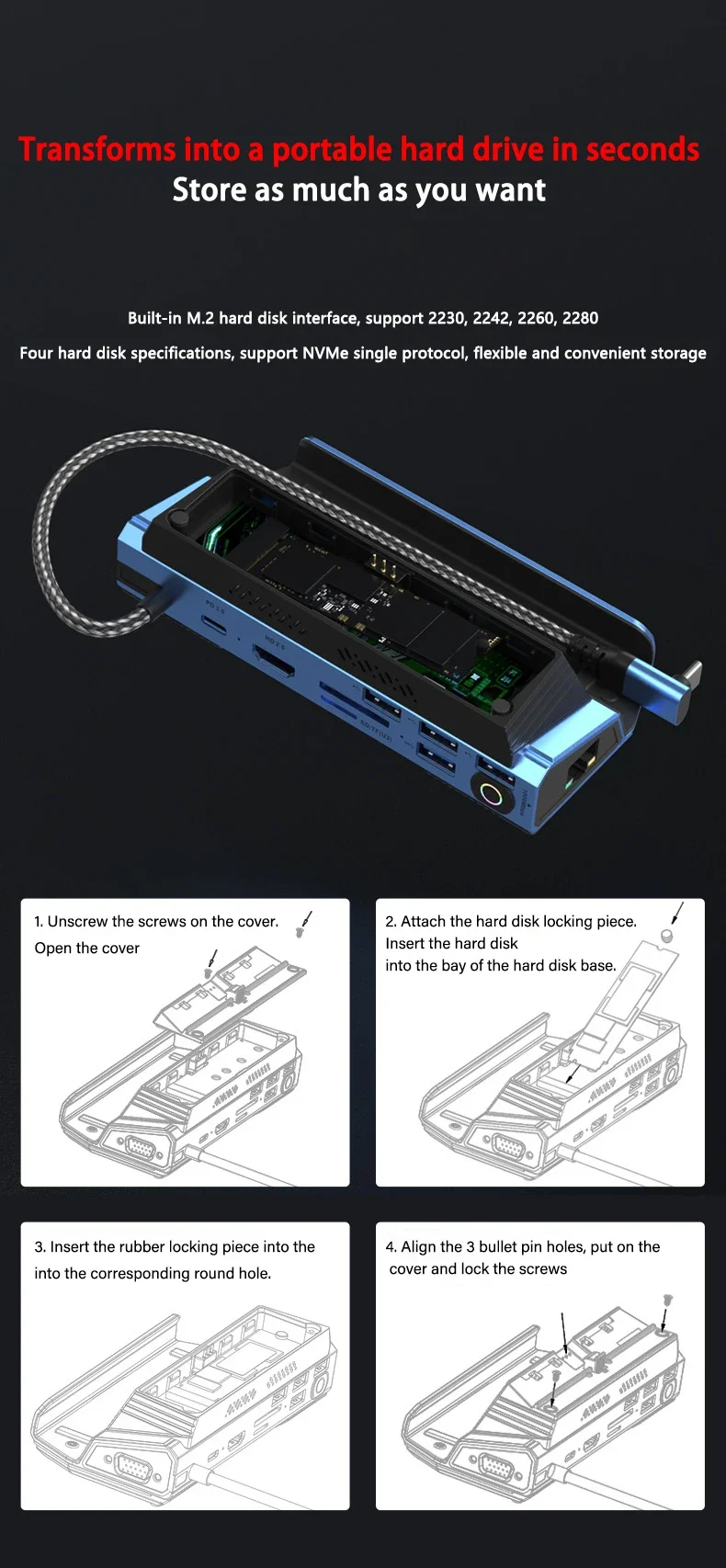 Type-C to :  PD100W+HD 4K60HZ+SD/FT card reader+USB2.0*3+USB3.0+RJ45-1000Mbps+NVMe port