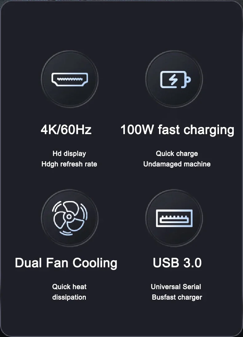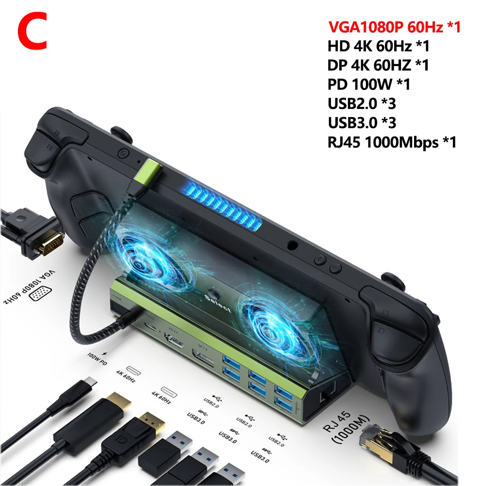Type-C to :  VGA 1080P 60Hz+HD 4K60HZ+DP 4K60HZ+PD100W+USB2.0*3+USB3.0*3+RJ45-1000Mbps